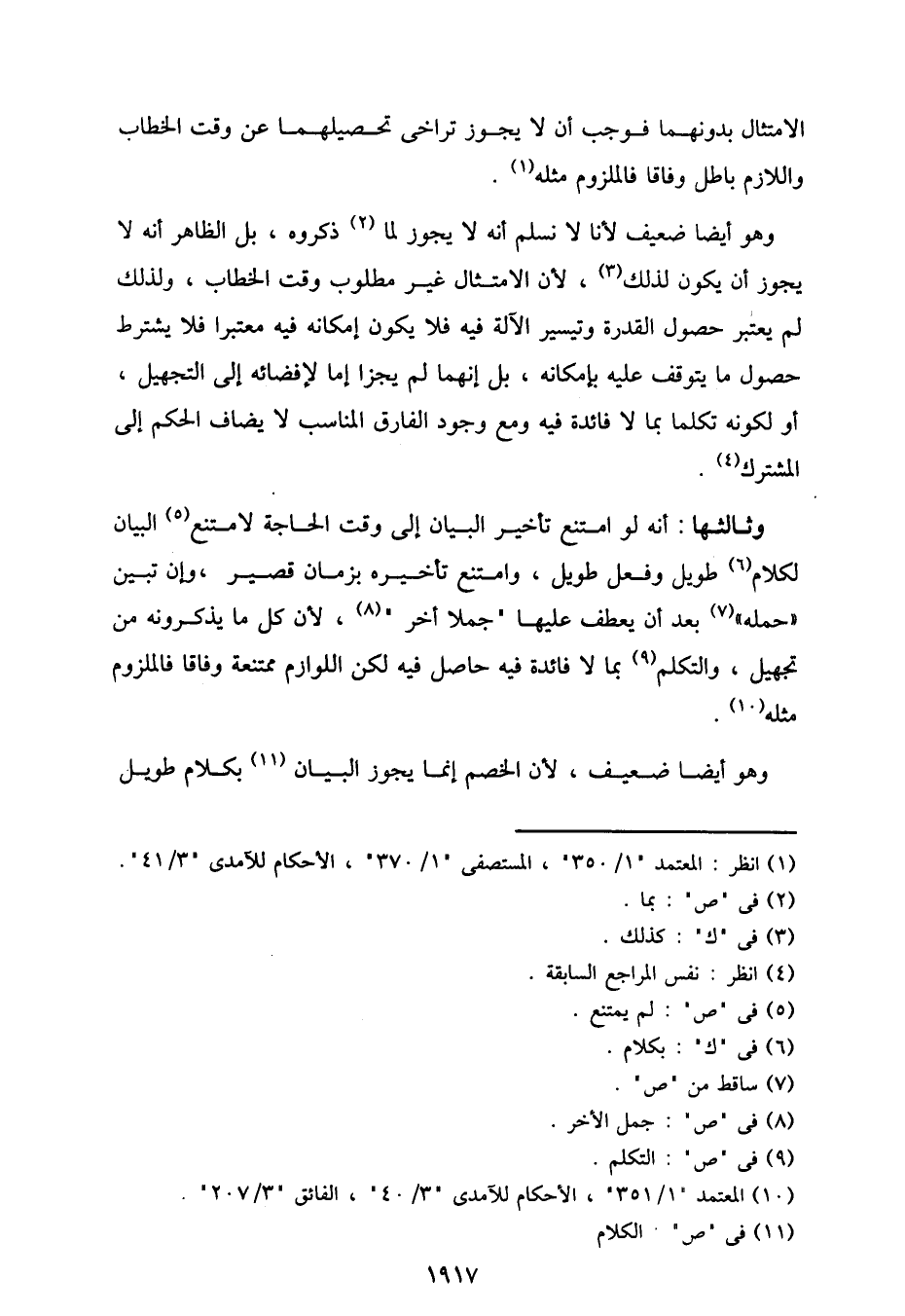 وثالثها: أنه لو امتنع تأخير البيان إلى وقت الحاجة لامتنع البيان لكلام طويل وفعل طويل، وامتنع تأخيره بزمان قصير، وإن تبين "حمله" بعد أن يعطف عليها "جملا أخر" لأن كل ما يذكرونه من تجهيل، والتكلم بما لا فائدة فيه حاصل فيه لكن اللوازم ممتنعة وفاقا فالملزوم مثله.