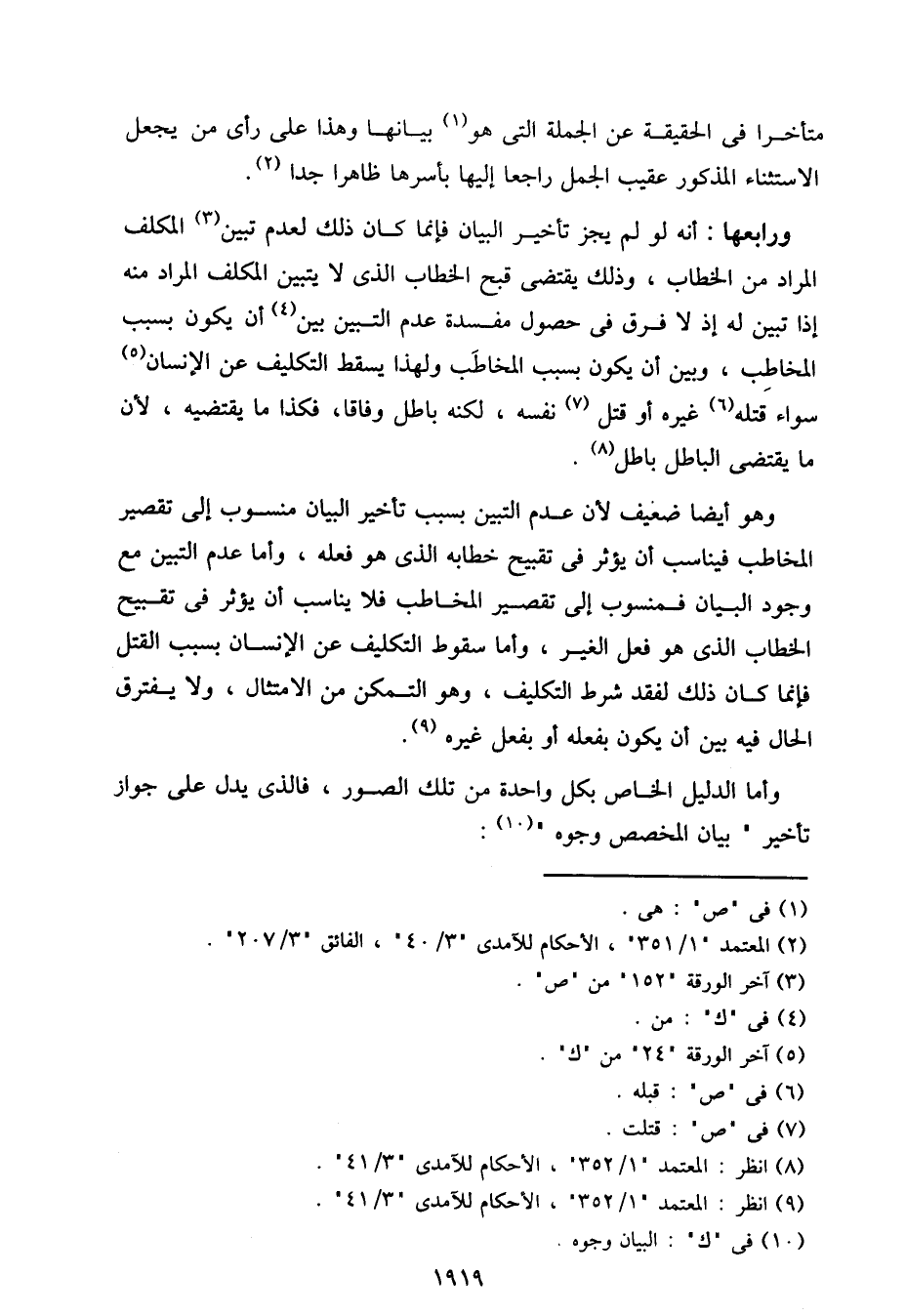 ورابعها: أنه لو لم يجز تأخير البيان فإنما كان ذلك لعدم تبين المكلف المراد من الخطاب، وذلك يقتضي قبح الخطاب الذي لا يتبين المكلف المراد منه إذا تبين له إذ لا فرق في حصول مفسدة عدم التبين بين أن يكون بسبب المخاطب، وبين أن يكون بسبب المخاطب ولهذا يسقط التكليف عن الإنسان سواء قتله غيره أو قتل نفسه، لكنه باطل وفاقا، فكذا ما يقتضيه، لأن ما يقتضي الباطل باطل.