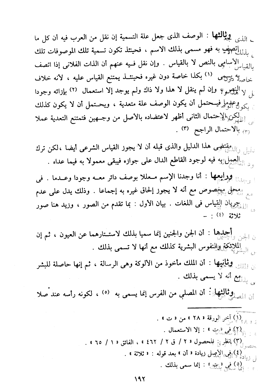 وثالثها: الوصف الذي جعل علة التسمية إن نقل من العرب فيه أن كل ما اتصف به فهو مسمى بذلك الاسم، فحينئذ تكون تسمية تلك الموصوفات تلك الأسامى بالنص لا بالقياس. وإن نقل فيه عنهم أن الذات الفلاني إذا اتصف به يسمى بكذا خاصة دون غيره فحينئذ يمتنع القياس عليه، لأنه خلاف النص، وإن لم ينقل لا هذا ولا ذاك ولم يوجد إلا استعمال بإزائه وجودا وعدما فيحتمل أن يكون الوصف علة متعدية، ويحتمل أن لا يكون كذلك لكن الاحتمال الثاني أظهر لاعتضاده بالأصل من وجهين فتمتنع التعدية عملا بالاحتمال الراجح.