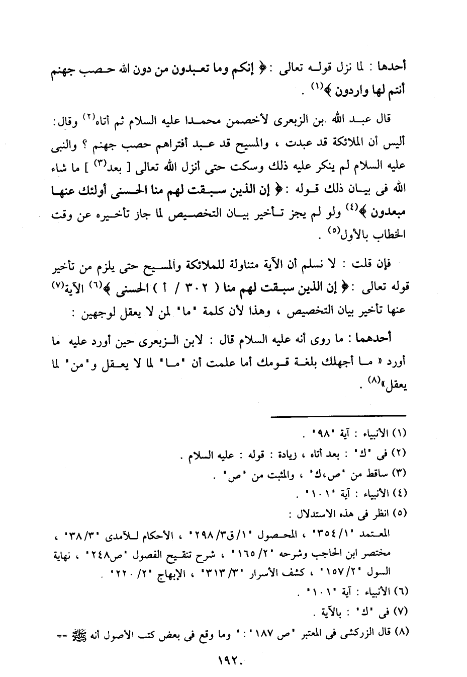 قال عبد الله بن الزبعري لأخصمن محمدا عليه السلام ثم أتاه وقال: أليس أن الملائكة قد عبدت، والمسيح قد عبد أفتراهم حصب جهنم؟ والنبي عليه السلام لم ينكر عليه ذلك وسكت حتى أنزل الله تعالى] بعد [ما شاء الله في بيان ذلك قوله:} إن الذين سبقت لهم منا الحسنى أولئك عنها مبعدون {ولو لم يجز تأخير بيان التخصيص لما جاز تأخيره عن وقت الخطاب بالأول.