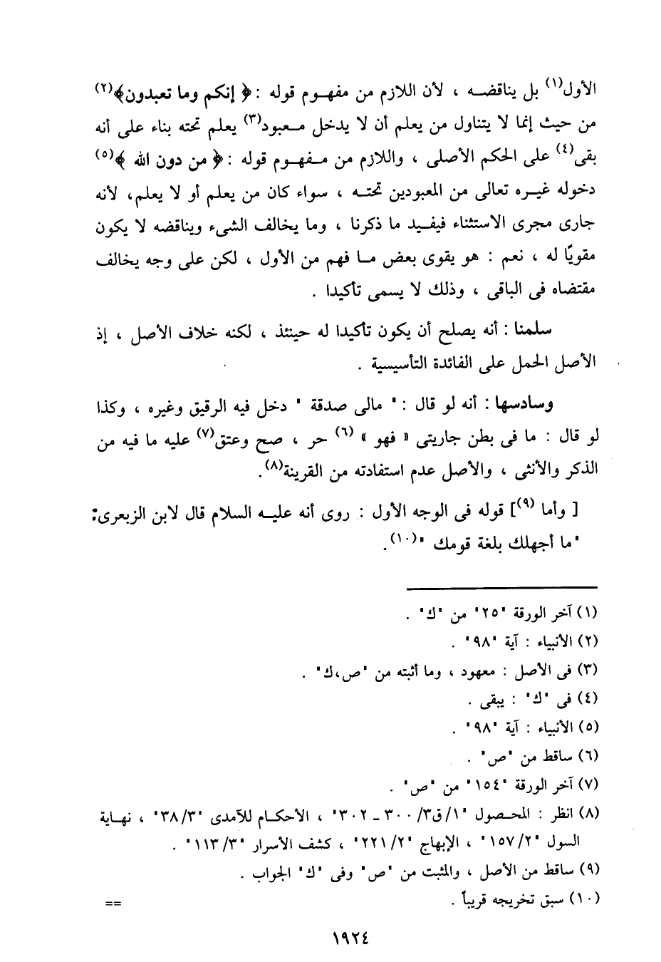 الأول بل يناقضه، لان اللازم من مفهوم قوله:} إنكم وما تعبدون {من حيث إنما لا يتناول من يعلم أن لا يدخل معبود يعلم تحته بناء على أنه بقى على الحكم الأصلي، واللازم من مفهوم قوله:} من دون الله {دخوله غيره تعالى من المعبودين تحته، سواء كان من يعلم أو لا يعلم، لأنه جاري مجرى الاستثناء فيفيد ما ذكرنا، وما يخالف الشيء ويناقضه لا يكون مقويا له، نعم: هو يقوي بعض ما فهم من الأول، لكن على وجه يخالف مقتضاه في الباقي، وذلك لا يسمى تأكيدا.
