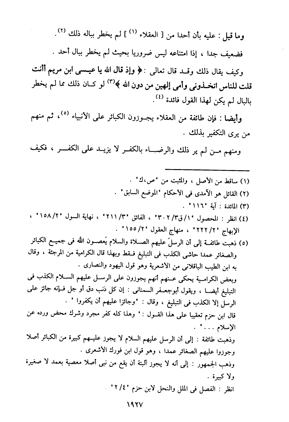 وأيضا: فإن طائفة من العقلاء يجوزون الكبائر على الأنبياء، ثم منهم من يرى التكفير بذلك.