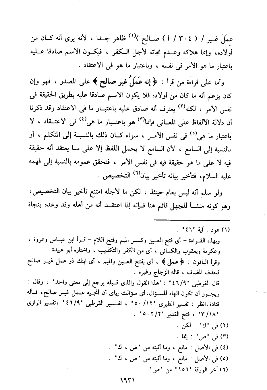 وأما على قراءة من قرأ:} إنه عمل غير صالح {على المصدر، فهو وإن كان يزعم أنه ما كان من أولاده فلا يكون الاسم صادقا عليه بطريق الحقيقة في نفس الأمر، لكنه يعترف أنه صادق عليه باعتبار ما في الاعتقاد وقد ذكرنا أن دلالة الألفاظ على المعاني فإنما هو باعتبار ما هي في الاعتقاد، لا باعتبار ما هي في نفس الأمر، سواء كان ذلك بالنسبة إلى المتكلم، أو بالنسبة إلى السامع، لأن السامع لا يحمل اللفظ إلا على ما يعتقد أنه حقيقة فيه لا على ما هو حقيقة فيه في نفس الأمر، فتحقق عمومه بالنسبة إلى فهمه عليه السلام، فتأخير بيانه تأخير بيان التخصيص.