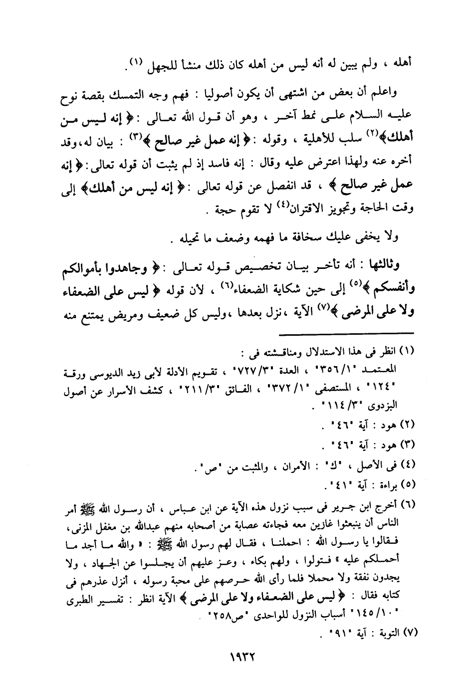 وثالثها: أنه تأخر بيان تخصيص قوله تعالى:} وجاهدوا بأموالكم وأنفسكم {إلى حين شكاية الضعفاء، لأن قوله} ليس على الضعفاء ولا على المرضى {الآية، نزل بعدها، وليس كل ضعيف ومريض يمتنع منه