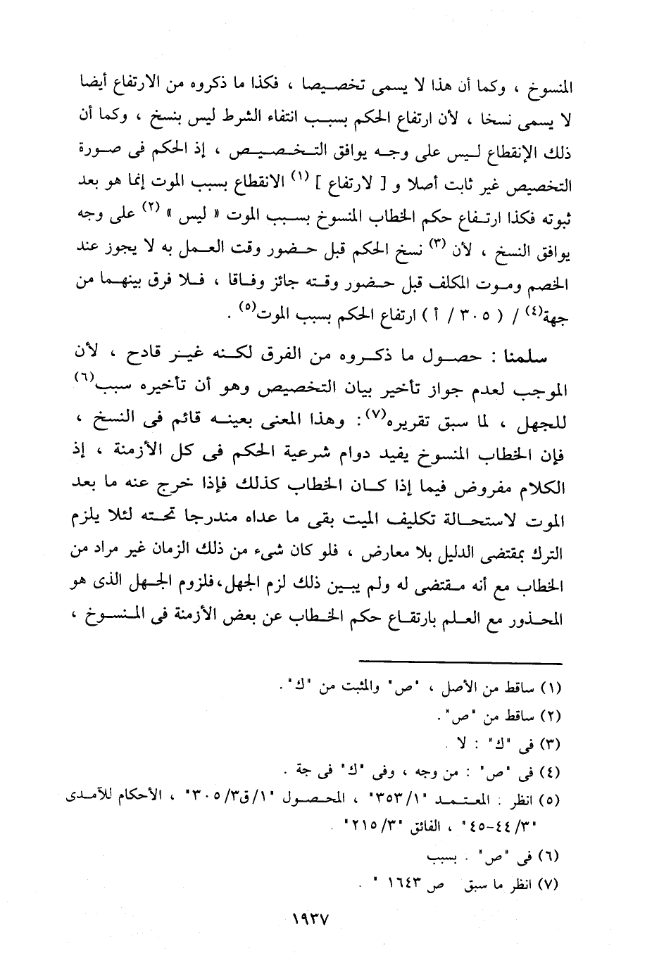 المنسوخ، وكما أن هذا لا يسمى تخصيصا، فكذا ما ذكروه من الارتفاع أيضا لا يسمى نسخا، لأن ارتفاع الحكم بسبب انتفاء الشرط ليس بنسخ، وكما أن ذلك الانقطاع ليس على وجه يوافق التخصيص، إذ الحكم في صورة التخصيص غير ثابت أصلا و] لارتفاع [الانقطاع بسبب الموت إنما هو بعد ثبوته فكذا ارتفاع حكم الخطاب المنسوخ بسبب الموت "ليس" على وجه يوافق النسخ، لأن نسخ الحكم قبل حضور وقت العمل به لا يجوز عند الخصم وموت المكلف قبل حضور وقته جائز وفاقا، فلا فرق بينهما من جهة / (305/أ) ارتفاع الحكم بسبب الموت.