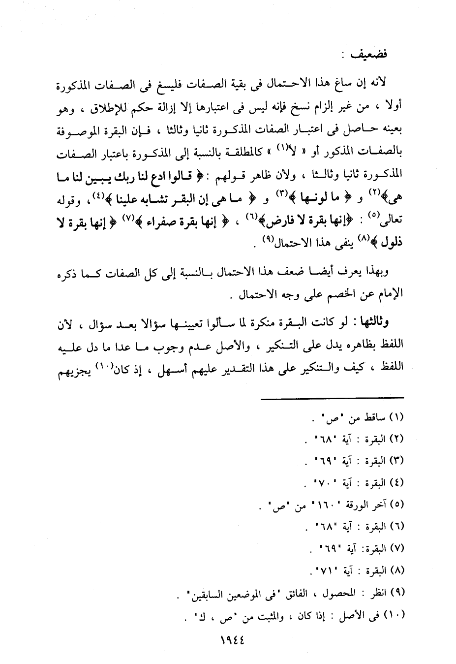 لأنه إن ساغ هذا الاحتمال في بقية الصفات فليسغ في الصفات المذكورة أولا، من غير إلزام نسخ فإنه ليس في اعتبارها إلا إزالة حكم للإطلاق، وهو بعينه حاصل في اعتبار الصفات المذكورة ثانيا وثالثا، فإن البقرة الموصوفة بالصفات المذكور أو "لا" كالمطلقة بالنسبة إلى المذكورة باعتبار الصفات المذكورة ثانيا وثالثا، ولأن ظاهر قولهم:} قالوا ادع لنا ربك يبين لنا ما هي {و} ما لونها {و} ما هي إن البقر تشابه علينا {وقوله تعالى:} إنها بقرة لا فارض {،} إنها بقرة صفراء {} إنها بقرة لا ذلول {ينفي هذا الاحتمال.