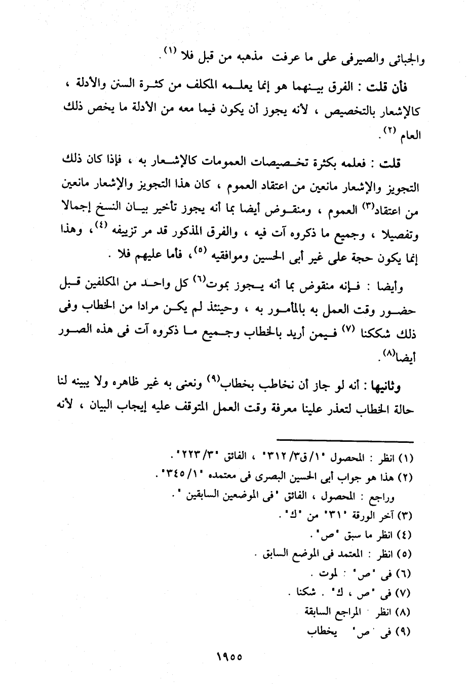 قلت: فعلمه بكثرة تخصيصات العمومات كالإشعار به، فإذا كان ذلك التجويز والإشعار مانعين من اعتقاد العموم، كان هذا التجويز والإشعار مانعين من اعتقاد العموم، ومنقوض أيضا بما أنه يجوز تأخير بيان النسخ إجمالا وتفصيلا، وجميع ما ذكروه آت فيه، والفرق المذكور قد مر تزييفه، وهذا إنما يكون حجة على غير أبي الحسين وموافقيه، فأما عليهم فلا.