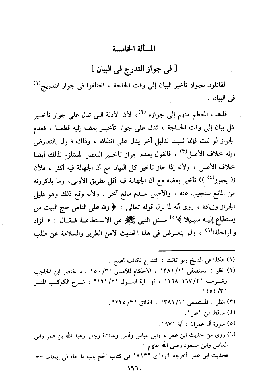 فذهب المعظم منهم إلى جوازه، لأن الأدلة التي تدل على جواز تأخير كل بيان إلى وقت الحاجة، تدل على جواز تأخير بعضه إليه قطعا، فعدم الجواز لو ثبت فإنما ثبت لدليل آخر يدل على انتفائه، وذلك قول بالتعارض وإنه خلاف الأصل، فالقول بعدم جواز تأخير البعض المستلزم لذلك أيضا خلاف الأصل، ولأنه إذا جاز تأخير كل البيان مع أن الجهالة فيه أكثر، فلأن "يجوز" تأخير بعضه مع أن الجهالة فيه أقل بطريق الأولى، وما يذكرونه من المانع سنجيب عنه، والأصل عدم مانع آخر، ولأنه وقع ذلك وهو دليل الجواز وزيادة، روى أنه لما نزل قوله تعالى:} ولله على الناس حج البيت من استطاع إليه سبيلا {سئل النبي صلى الله عليه وسلم عن الاستطاعة فقال: "الزاد والراحلة"، ولم يتعرض في هذا الحديث لأمن الطريق والسلامة عن طلب