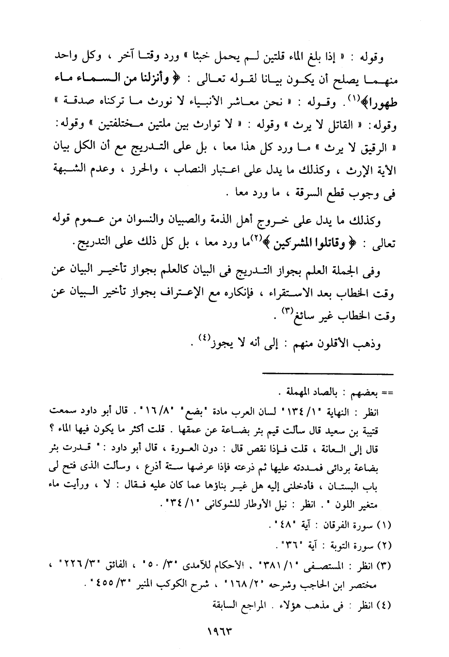وقوله: "إذا بلغ الماء قلتين لم يحمل خبثا" ورد وقتا آخر، وكل واحد منهما يصلح أن يكون بيانا لقوله تعالى:} وأنزلنا من السماء ماء طهورا {وقوله: "نحن معاشر الأنبياء لا نورث ما تركناه صدقة" وقوله: "القاتل لا يرث" وقوله: "لا توارث بين ملتين مختلفتين" وقوله: "الرقيق لا يرث" ما ورد كل هذا معا، بل على التدريج مع أن الكل بيان في وجوب قطع السرقة، ما ورد معا.
