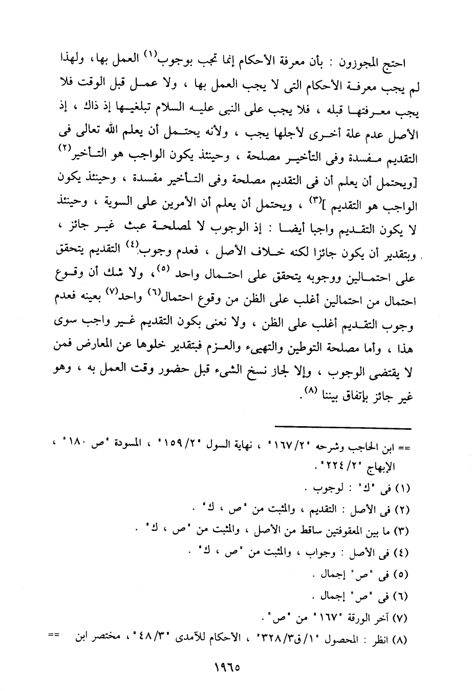 احتج المجوزون: بأن معرفة الأحكام إنما تجب بوجوب العمل بها، ولهذا لم يجب معرفة الأحكام التي لا يجب العمل بها، ولا عمل قبل الوقت فلا يجب معرفتها قبله، فلا يجب على النبي عليه السلام تبليغها إذ ذاك، غذ الأصل عدم علة أخرى لأجلها يجب، ولأنه يحتمل أن يعلم الله تعالى في التقديم مفسدة وفي التأخير مصلحة، وحينئذ يكون الواجب هو التأخير] ويحتمل أن يعلم أن في التقديم مصلحة وفي التأخير مفسدة، وحينئذ يكون الواجب هو التقديم [، ويحتمل أن يعلم أن الأمرين على السوية، وحينئذ لا يكون التقديم واجبا أيضا: إذ الوجوب لا لمصلحة عبث غير جائز، وبتقدير أن يكون جائزا لكنه خلاف الأصل، فعدم وجوب التقديم يتحقق على احتمالين ووجوبه يتحقق على احتمال واحد، ولا شك أن وقوع احتمال من احتمالين أغلب على الظن من وقوع احتمال واحد بعينه فعدم وجوب التقديم أغلب على الظن، ولا نعني بكون التقديم غير واجب سوى هذا، وأما مصلحة التوطين والتهيئ والعزم فبتقدير خلوها عن المعارض فمن لا يقتضي الوجوب، وإلا لجاز نسخ الشيء قبل حضور وقت العمل به، وهو غير جائز باتفاق بيننا.