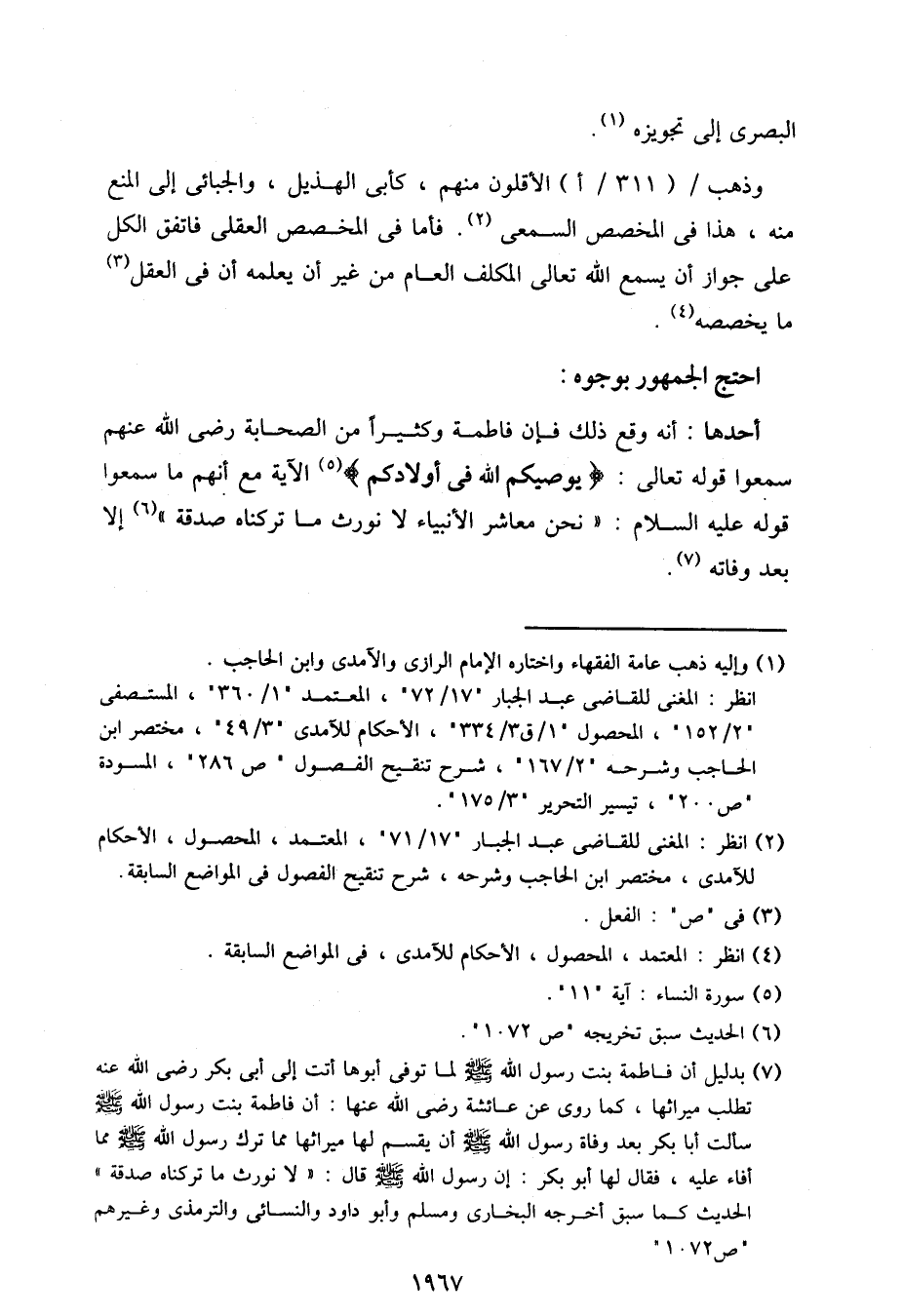 وذهب / (311/أ) الأقلون منهم، كأبي الهذيل، والجبائي إلى المنع منه، هذا في المخصص السمعي. فأما في المخصص العقلي فاتفق الكل على جواز أن يسمع الله تعالى المكلف العام من غير أن يعلمه أن في العقل ما يخصصه.