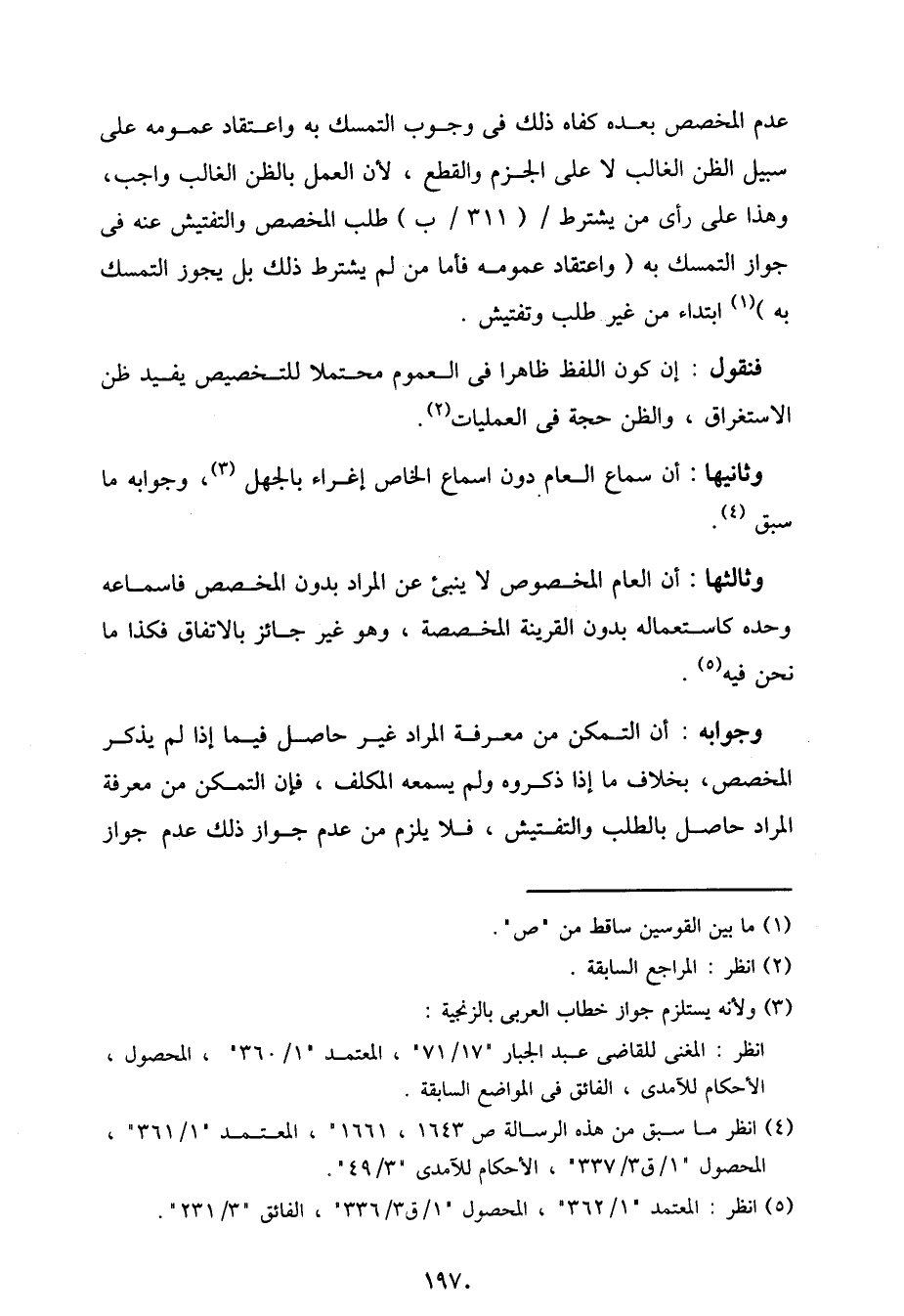عدم المخصص بعده كفاه ذلك في وجوب التمسك به واعتقاد عمومه على سبيل الظن الغالب لا على الجزم والقطع، لأن العمل بالظن الغالب واجب، وهذا على رأي من يشترط / (311/ب) طلب المخصص والتفتيش عنه في جواز التمسك به (واعتقاد عمومه فأما من لم يشترط ذلك بل يجوز التمسك به) ابتداء من غير طلب وتفتيش.