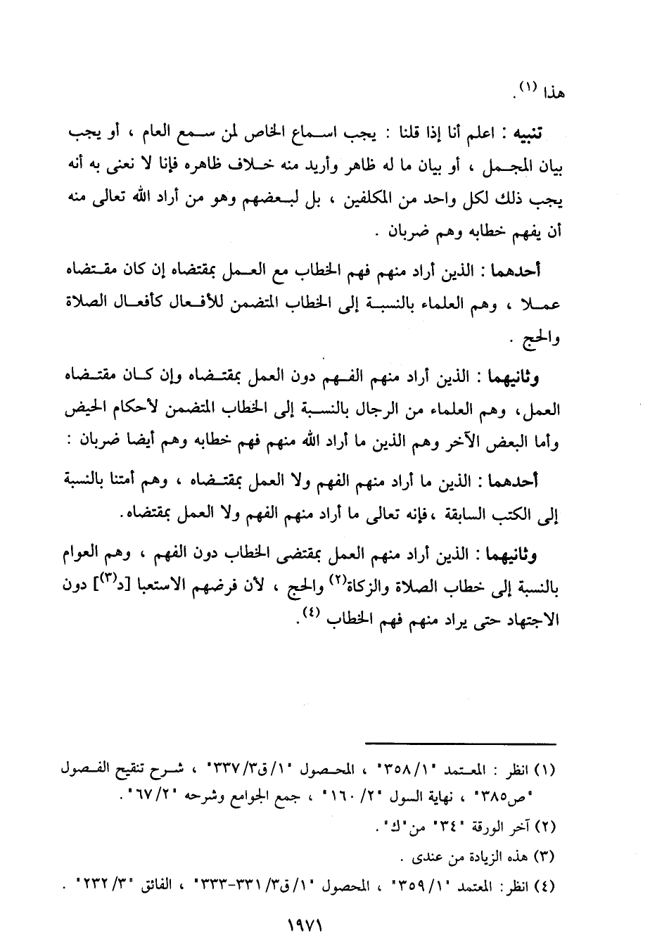 وثانيهما: الذين أراد منهم العمل بمقتضى الخطاب دون الفهم، وهم العوام بالنسبة إلى خطاب الصلاة والزكاة والحج، لأن فرضهم الاستعبا] د [دون الاجتهاد حتى يراد منهم فهم الخطاب.