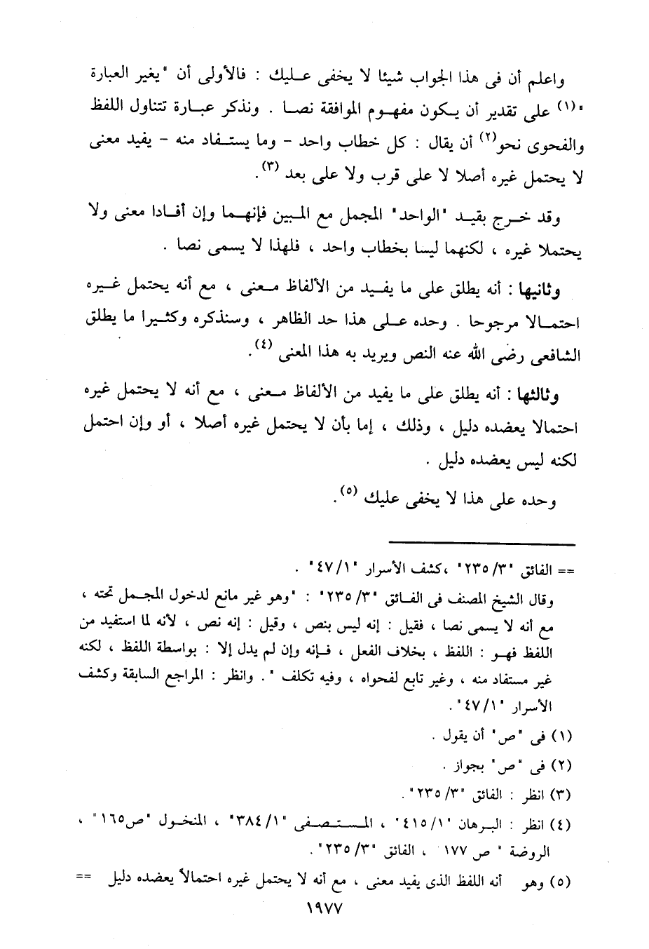 وثانيها: أنه يطلق على ما يفيد من الألفاظ معنى، مع أنه يحتمل غيره احتمالا مرجوحا. وحده على هذا حد الظاهر، وسنذكره وكثيرا ما يطلق الشافعي رضي الله عنه النص ويريد به هذا المعنى.