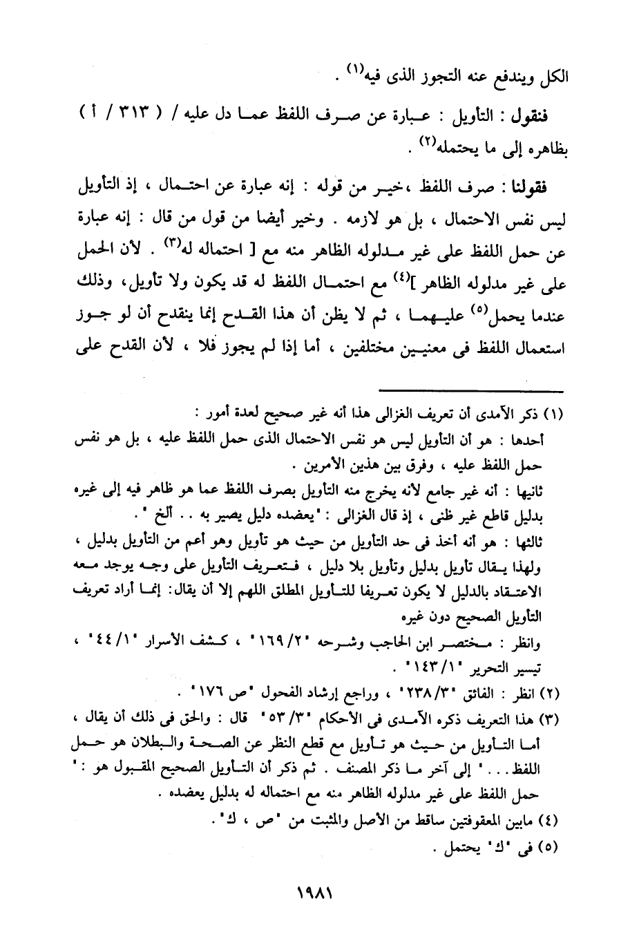فتقول: التأويل: عبارة عن صرف اللفظ عما دل عليه / (313/أ) بظاهره إلى ما يحتمله.