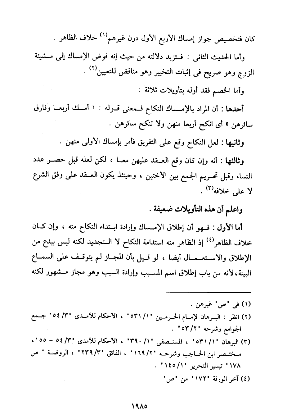 وأما الحديث الثاني: فتزيد دلالته من حيث إنه فوض الإمساك إلى مشيئة الزوج وهو صريح في إثبات التخيير وهو مناقض للتعيين.