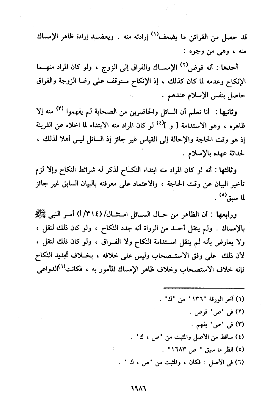 ورابعها: أن الظاهر من حال السائل امتثال / (314/أ) أمر النبي صلى الله عليه وسلم بالإمساك. ولم ينقل أحد من الرواة أنه جدد النكاح، ولو كان ذلك لنقل، ولا يعارض بأنه لم ينقل استدامة النكاح ولا الفراق، ولو كان ذلك لنقل، لأن ذلك على وفق الاستصحاب وليس على خلافه، بخلاف تجديد النكاح فإنه خلاف الاستصحاب وخلاف ظاهر الإمساك المأمور به، فكانت الدواعي