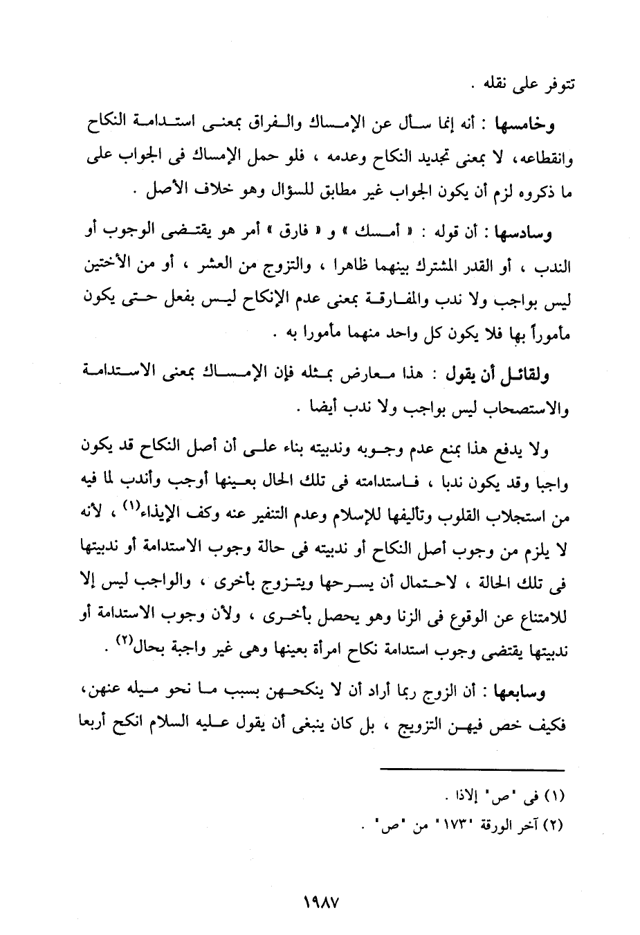ولا يدفع هذا بمنع عدم وجوبه وندبيته بناء على أن أصل النكاح قد يكون واجبا وقد يكون نديا، فاستدامته في تلك الحال بعينها أوجب وأندب لما فيه من استجلاب القلوب وتأليفها للإسلام وعدم التنفير عنه وكف الإيذاء، لأنه لا يلزم من وجوب أصل النكاح أو ندبيته في حالة وجوب الاستدامة أو ندبيتها في تلك الحالة، لاحتمال أن يسرحها ويتزوج بأخرى، والواجب ليس إلا للامتناع عن الوقوع في الزنا وهو يحصل بأخرى، ولأن وجوب الاستدامة أو ندبيتها يقتضي وجوب استدامة نكاح امرأة بعينها وهي غير واجبة بحال.