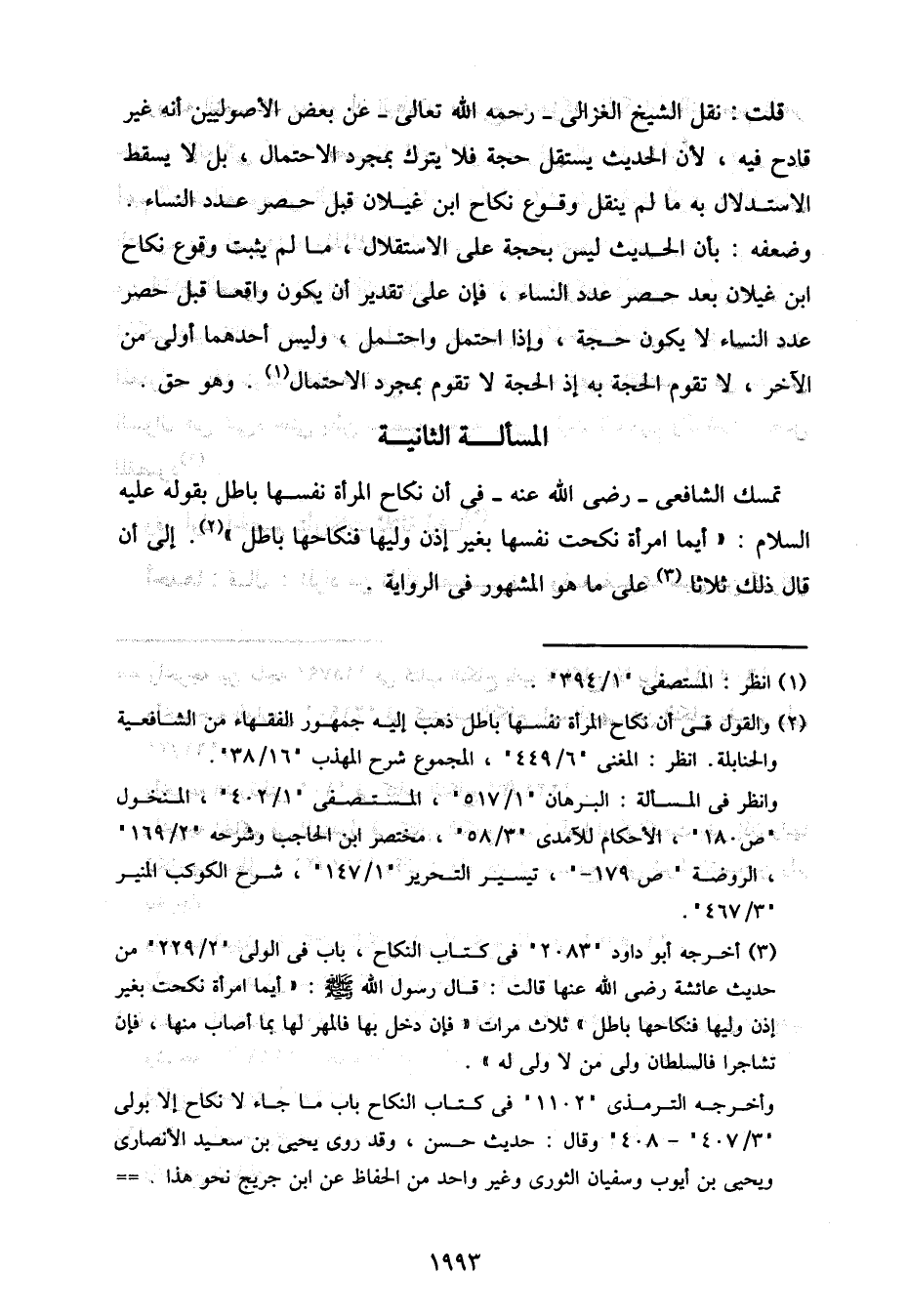 تمسك الشافعي- رضي الله عنه- في أن نكاح المرأة نفسها باطل بقوله عليه السلام": أيما امرأة نكحت نفسها بغير إذن وليها فنكاحها باطل". إلى أن قال ذلك ثلاثا على ما هو المشهور في الرواية.