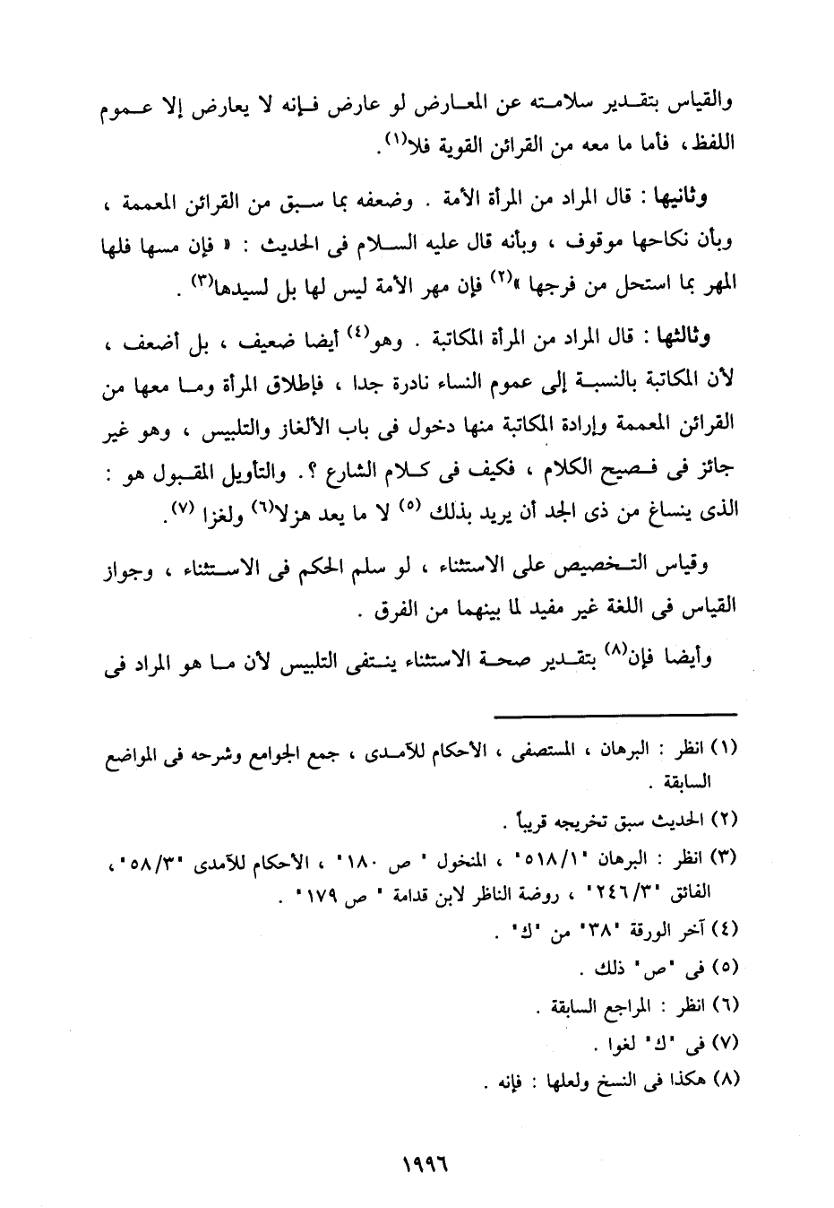 وثالثها: قال المراد من المرأة المكاتبة. وهو أيضا ضعيف، بل أضعف، لأن المكاتبة بالنسبة إلى عموم النساء نادرة جدا، فإطلاق المرأة وما معها من القرائن المعممة وإرادة المكاتبة منها دخول في باب الألغاز والتلبيس، وهو غير جائز في فصيح الكلام، فكيف في كلام الشارع؟ والتأويل المقبول هو: الذي يساغ من ذي الجد أن يريد بذلك لا ما يعد هزلا ولغزا.