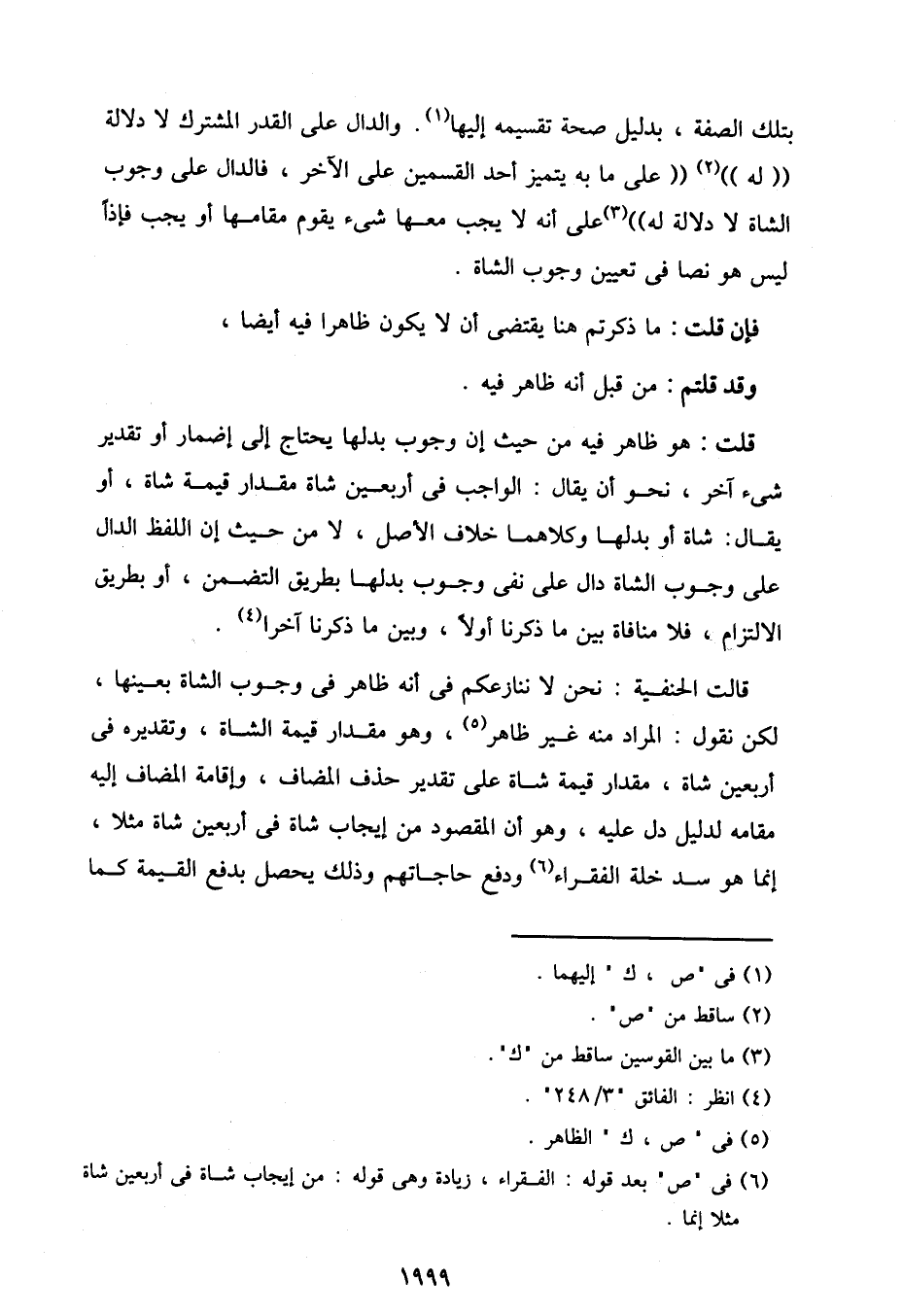 بتلك الصفة، بدليل صحة تقسيمه إليها. والدال على القدر المشترك لا دلالة "له" "على ما به يتميز أحد القسمين على الآخر، فالدال على وجوب الشاة لا دلالة له" على أنه لا يجب معها شيء يقوم مقامها أو يجب فإذا ليس هو نصا في تعيين وجوب الشاة.
