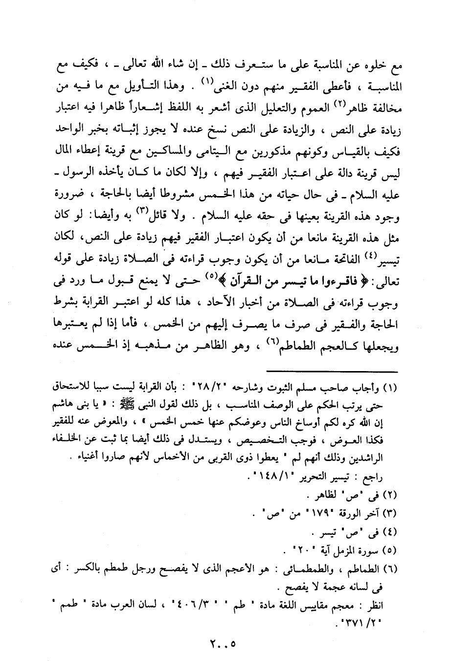 مع خلوه عن المناسبة على ما ستعرف ذلك- إن شاء الله تعالى-، فكيف مع المناسبة، فأعطى الفقير منهم دون الغني. وهذا التأويل مع ما فيه من مخالفة ظاهر العموم والتعليل الذي أشعر به اللفظ إشعارا ظاهرا فيه اعتبار زيادة على النص، والزيادة على النص نسخ عنده لا يجوز إثباته بخبر الواحد فكيف بالقياس وكونهم مذكورين مع اليتامى والمساكين مع قرينة إعطاء المال ليس قرينة دالة على اعتبار الفقير فيهم، وإلا لكان ما كان يأخذه الرسول- عليه السلام- في حال حياته من هذا الخمس مشروطا أيضا بالحاجة، ضرورة وجود هذه القرينة بعينها في حقه عليه السلام. ولا قائل به وأيضا: لو كان مثل هذه القرينة مانعا من أن يكون اعتبار الفقير فيهم زيادة على النص، لكان تيسير الفاتحة مانعا من أن يكون وجوب قراءته في الصلاة زيادة على قوله تعالى:} فاقرؤا ما تيسر من القرآن {حتى لا يمنع قبول ما ورد في وجوب قراءته في الصلاة من أخبار الآحاد، هذا كله لو اعتبر القرابة بشرط الحاجة والفقير في صرف ما يصرف إليهم من الخمس، فأما إذا لم يعتبرها ويجعلها كالعجم الطماطم، وهو الظاهر من مذهبه إذ الخمس عنده
