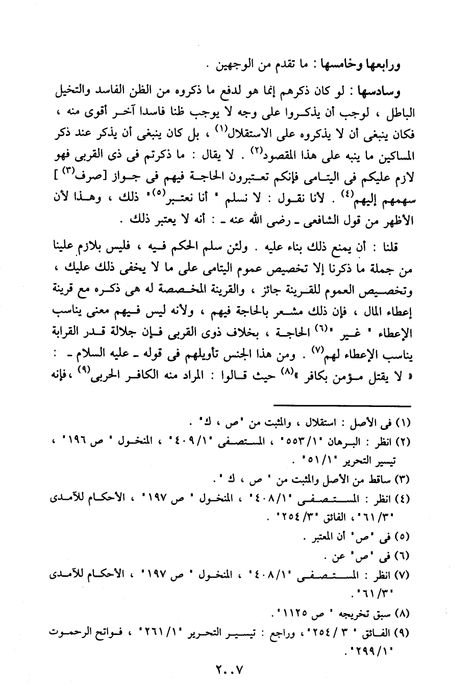 وسادسها: لو كان ذكرهم إنما هو لدفع ما ذكروه من الظن الفاسد والتخيل الباطل، لوجب أن يذكروا على وجه لا يوجب ظنا فاسدا آخر أقوى منه، فكان ينبغي أن لا يذكروه على الاستقلال، بل كان ينبغي أن يذكر عند ذكر المساكين ما ينبه على هذا المقصود. لا يقال: ما ذكرتم في ذي القربى فهو لازم عليكم في اليتامى فإنكم تعتبرون الحاجة فيهم في جواز] صرف [سهمهم إليهم. لأنا نقول: لا نسلم "أنا نعتبر ذلك، وهذا لأن الأظهر من قول الشافعي- رضي الله عنه-: أنه لا يعتبر ذلك.