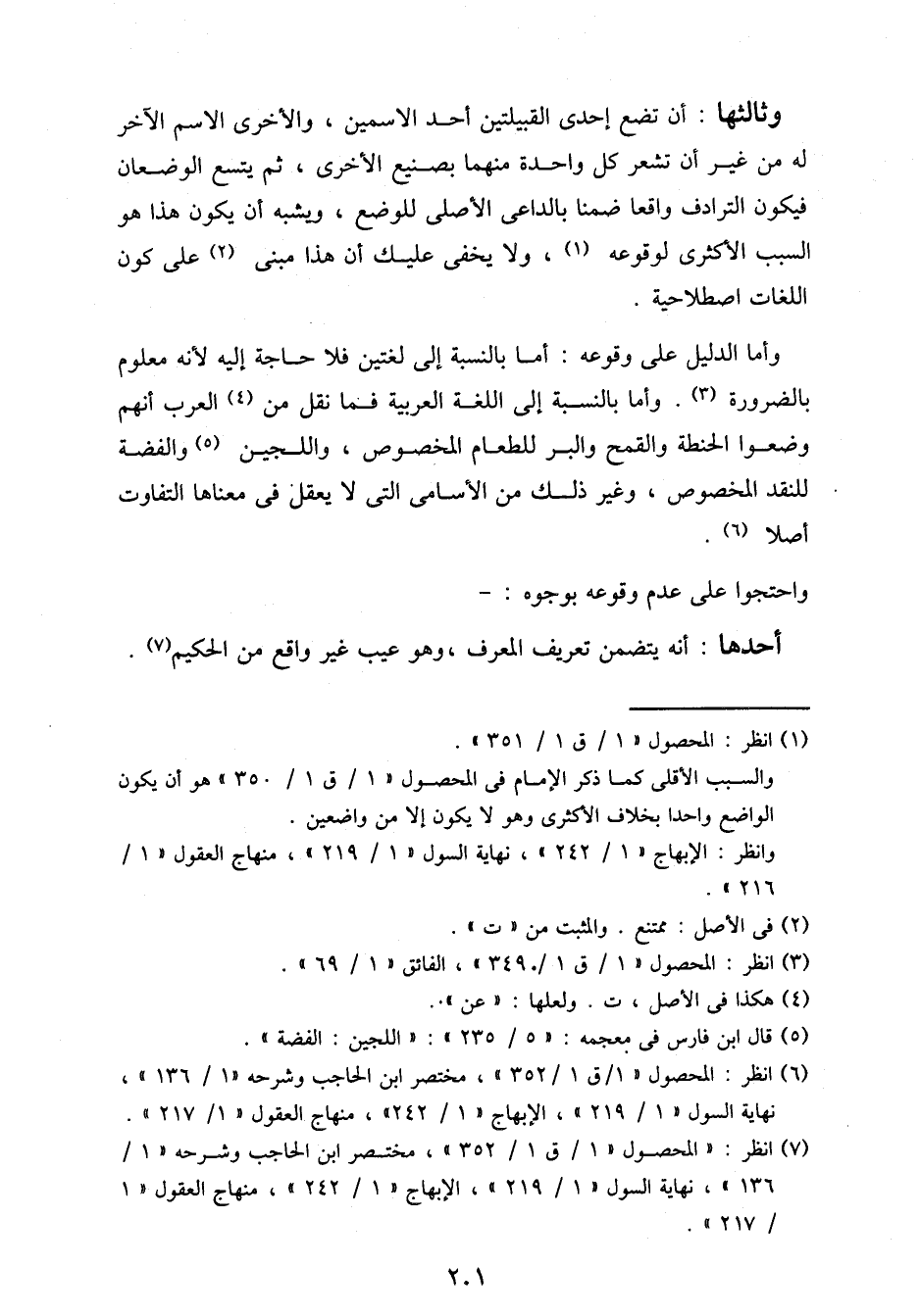 وأما الدليل على وقوعه: أما بالنسبة إلى لغتين فلا حاجة إليه لأنه معلوم بالضرورة. وأما بالنسبة إلى اللغة العربية فما نقل من العرب أنهم وضعوا الحنطة والقمح والبر للطعام المخصوص، واللجين والفضة للنقد المخصوص، وغير ذلك من الأسامي التي لا يعقل في معناها التفاوت أصلا.