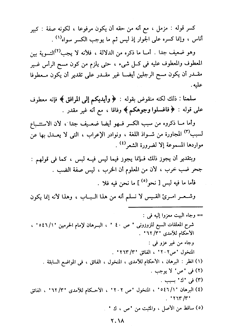 وهو ضعيف جدا. أما ما ذكره من الدلالة، فلأنه لا يجب التسوية بين المعطوف والمعطوف عليه في كل شيء، حتى يلزم من كون مسح الرأس غير مقدر أن يكون مسح الرجلين أيضا غير مقدر على تقدير أن يكون معطوفا عليه.