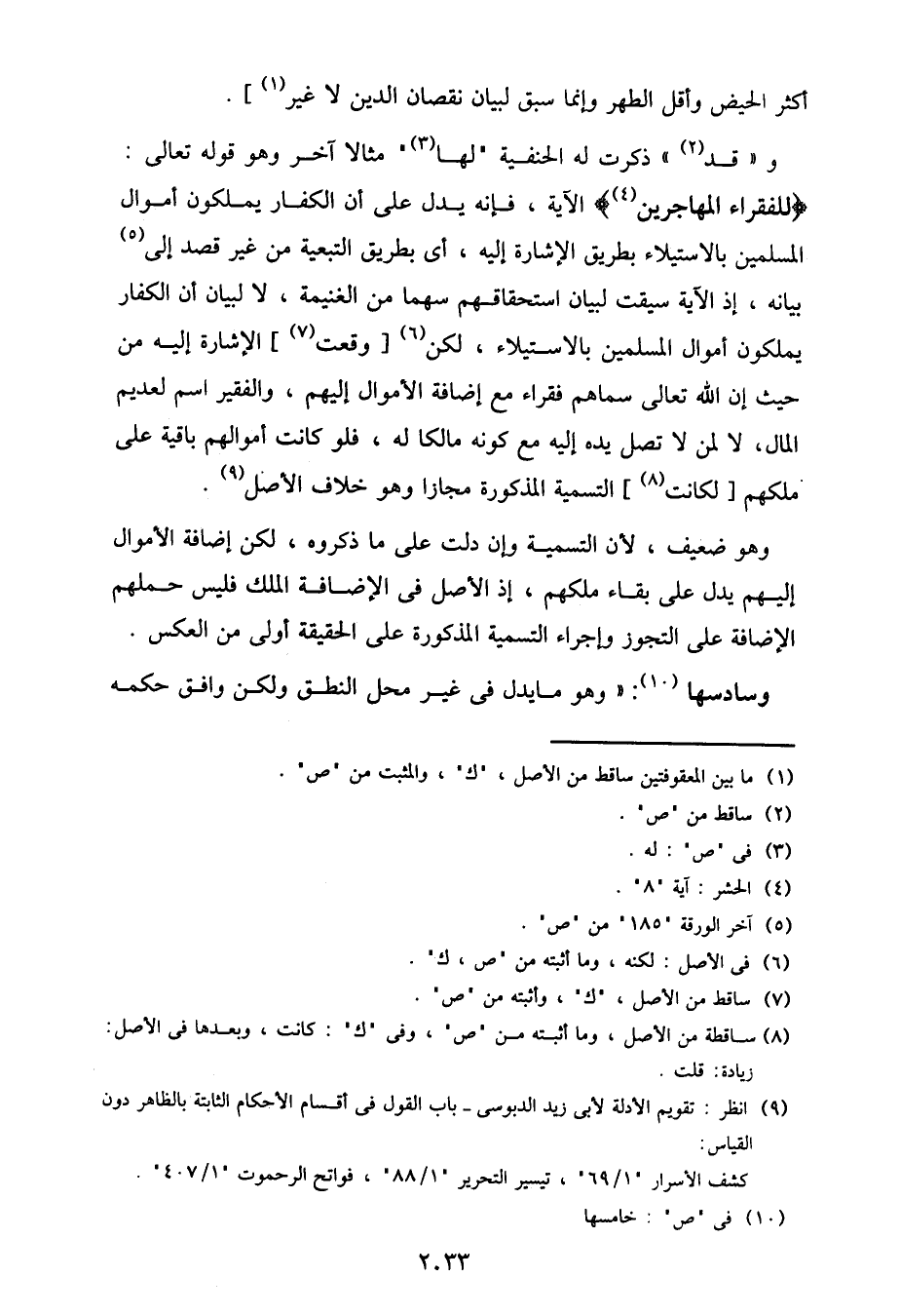 و"قد" ذكرت له الحنفية "لها" مثالا آخر وهو قوله تعالى:} للفقراء المهاجرين {الآية، فإنه يدل على أن الكفار يملكون أموال المسلمين بالاستيلاء بطريق الإشارة إليه، أي بطريق التبعية من غير قصد إلى بيانه، إذ الآية سيقت لبيان استحقاقهم سهما من الغنيمة، لا لبيان أن الكفار يملكون أموال المسلمين بالاستيلاء، لكن] وقعت [الإشارة إليه من حيث إن الله تعالى سماهم فقراء مع إضافة الأموال إليهم، والفقير اسم لعديم المال، لا لمن لا تصل يده إليه مع كونه مالكا له، فلو كانت أموالهم باقية على ملكهم] لكانت [التسمية المذكورة مجازا وهو خلاف الأصل.