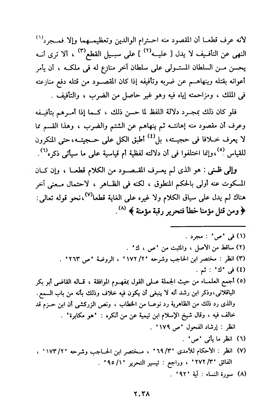 لأنه عرف قطعا أن المقصود منه احترام الوالدين وتعظيمهما وإلا فمجرد النهي عن التأفيف لا يدل] عليه [على سبيل القطع، ألا ترى أنه يحسن من السلطان المستولي على سلطان آخر منازع له في ملكه، أن يأمر أعوانه بقتله وينهاهم عن ضربه وتأفيفه إذا كان المقصود من قتله دفع منازعته في الملك، ومزاحمته إياه فيه وهو غير حاصل من الضرب، والتأفيف.