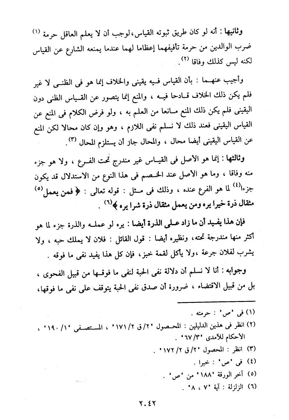 وثالثها: إنما هو الأصل في القياس غير مندرج تحت الفرع، ولا هو جزء منه وفاقا، وما هو الأصل عند الخصم في هذا النوع من الاستدلال قد يكون جزءا لما هو الفرع عنده، وذلك في مثل: قوله تعالى:} فمن يعمل مثقال ذرة خيرا يره ومن يعمل مثقال ذرة شرا يره {.