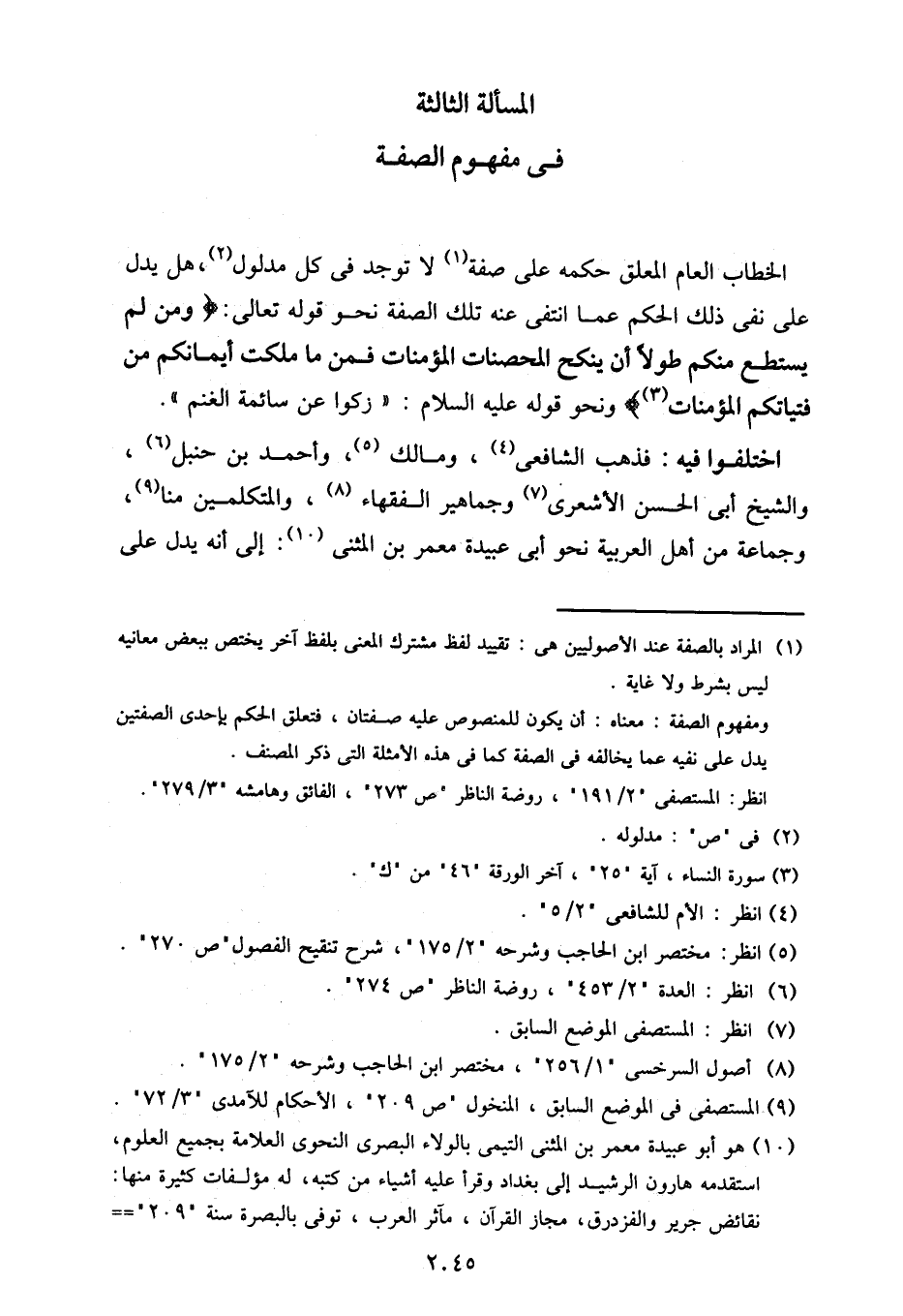 اختلفوا فيه: فذهب الشافعي، ومالك، وأحمد بن حنبل، والشيخ أبي الحسن الأشعري وجماهير الفقهاء، والمتكلمين منا، وجماعة من أهل العربية نحو أبي عبيدة معمر بن المثنى: إلى أنه يدل على