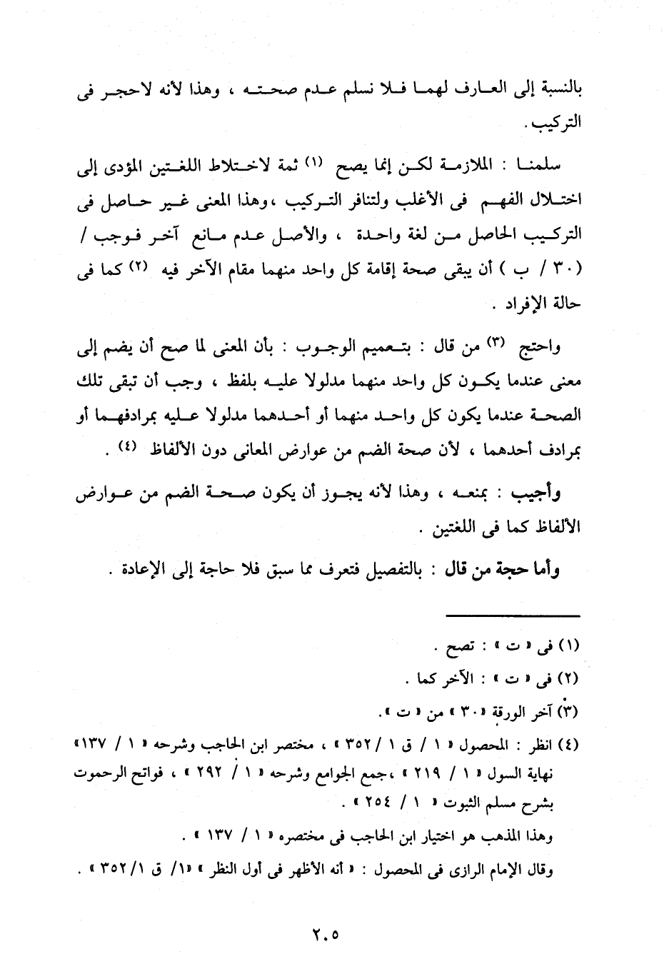 سلمنا: الملازمة لكن إنما يصح ثمة لاختلاط اللغتين المؤدي إلى اختلال الفهم في الأغلب ولتنافر التركيب، وهذا المعنى غير حاصل في التركيب الحاصل من لغة واحدة، والأصل عدم مانع آخر فوجب/ (30/ب) أن يبقى صحة إقامة كل واحد منهما مقام الآخر فيه كما في حالة الإفراد.