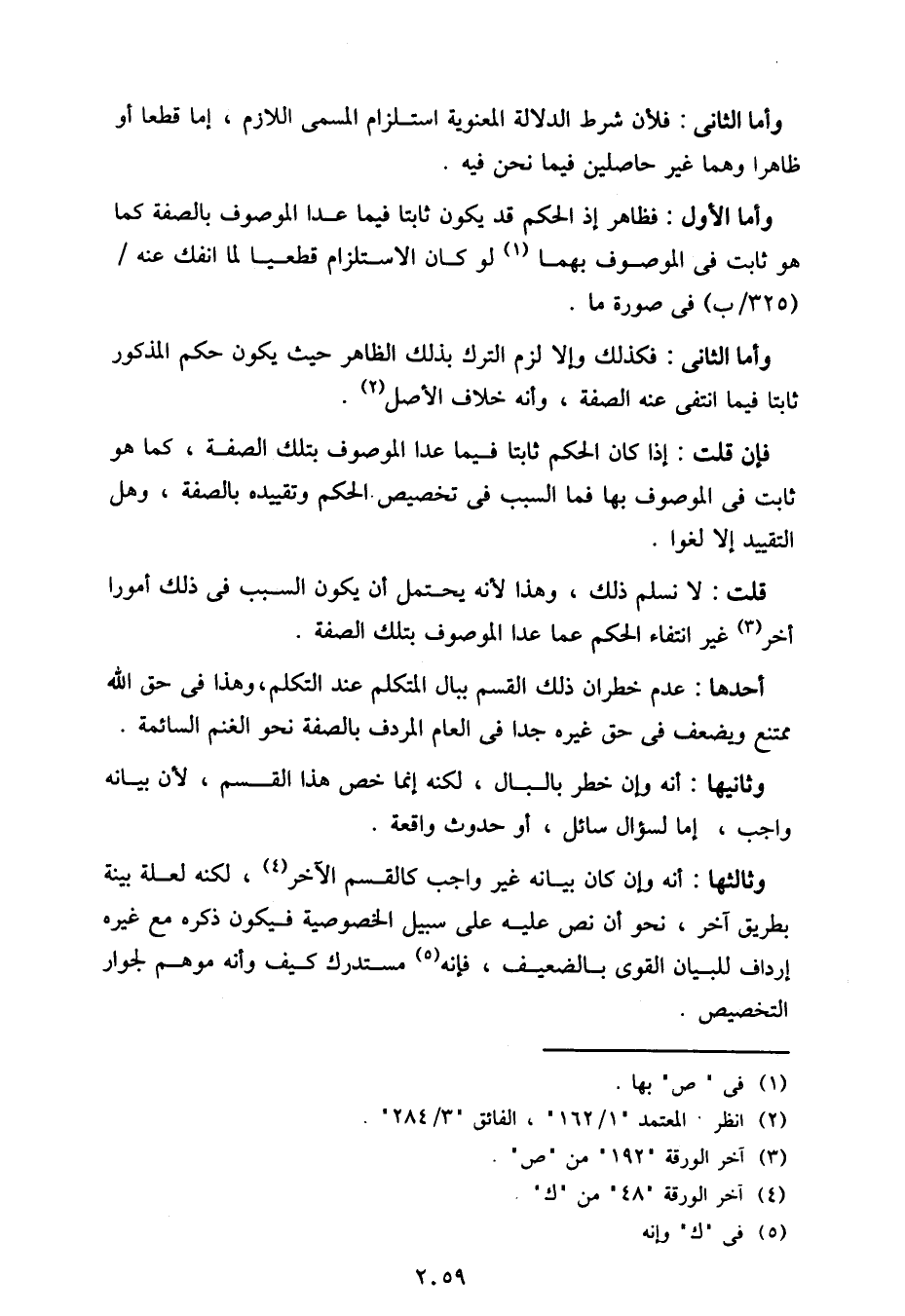 وأما الثاني: فكذلك وإلا لزم الترك بذلك الظاهر حيث يكون حكم المذكور ثابتا فيما انتفى عنه الصفة، وأنه خلاف الأصل.