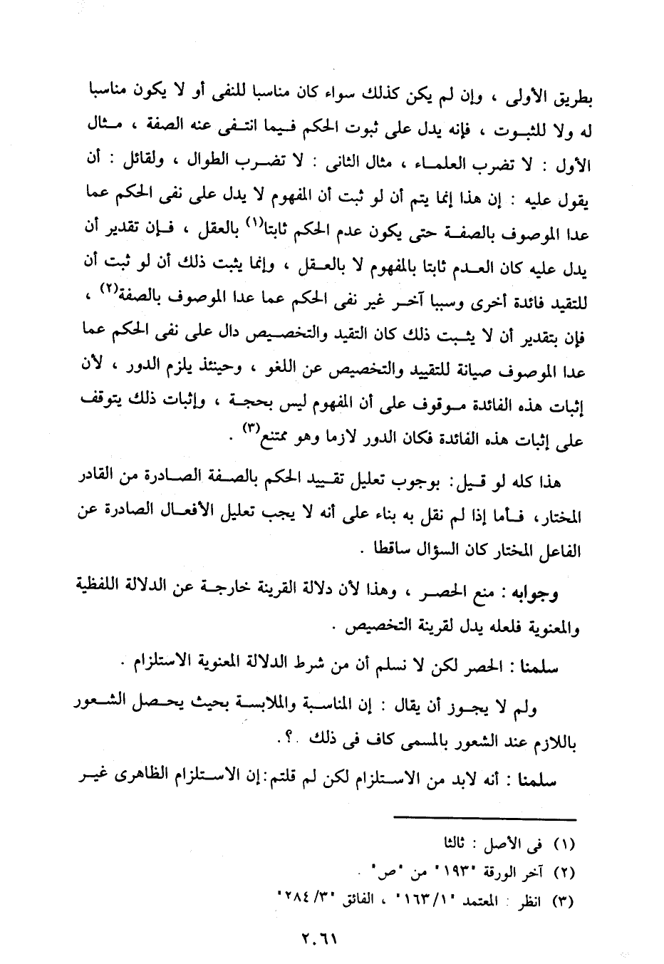 بطريق الأولى، وإن لم يكن كذلك سواء كان مناسبا للنفي أو لا يكون مناسبا له ولا للثبوت، فإنه يدل على ثبوت الحكم فيما انتفى عنه الصفة، مثال الأول: لا تضرب العلماء، مثال الثاني: لا تضرب الطوال، ولقائل: أن يقول عليه: إن هذا إنما يتم أن لو ثبت أن المفهوم لا يدل على نفي الحكم عما عدا الموصوف بالصفة حتى يكون عدم الحكم ثابتًا بالعقل، فإن تقدير أن يدل عليه كان العدم ثابتًا بالمفهوم لا بالعقل، وإنما يثبت ذلك أن لو ثبت أن للتقيد فائدة أخرى وسببًا آخر غير نفي الحكم عما عدا الموصوف بالصفة، فإن بتقدير أن لا يثبت ذلك كان التقيد والتخصيص دال على نفي الحكم عما عدا الموصوف صيانة للتقييد والتخصيص عن اللغو، وحينئذ يلزم الدور، لأن إثبات هذه الفائدة موقوف على أن المفهوم ليس بحجة، وإثبات ذلك يتوقف على إثبات هذه الفائدة فكان الدور لازما وهو ممتنع.