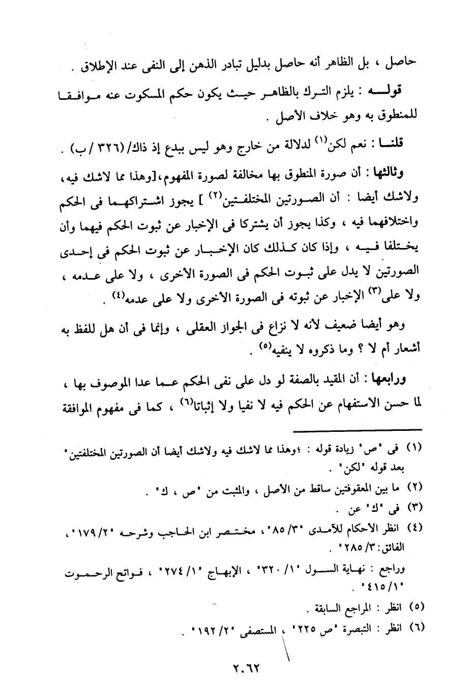 وثالثها: أن صورة المنطوق بها مخالفة لصورة المفهوم، [وهذا مما لا شك فيه، ولا شك أيضًا: أن الصورتين المختلفتين] يجوز اشتراكهما في الحكم واختلافهما فيه، وكذا يجوز أن يشتركا في الإخبار عن ثبوت الحكم فيهما وأن يختلفا فيه، وإذا كان كذلك كان الإخبار عن ثبوت الحكم في إحدى الصورتين لا يدل على ثبوت الحكم في الصورة الأخرى، ولا على عدمه، ولا على الإخبار عن ثبوته في الصورة الأخرى ولا على عدمه.