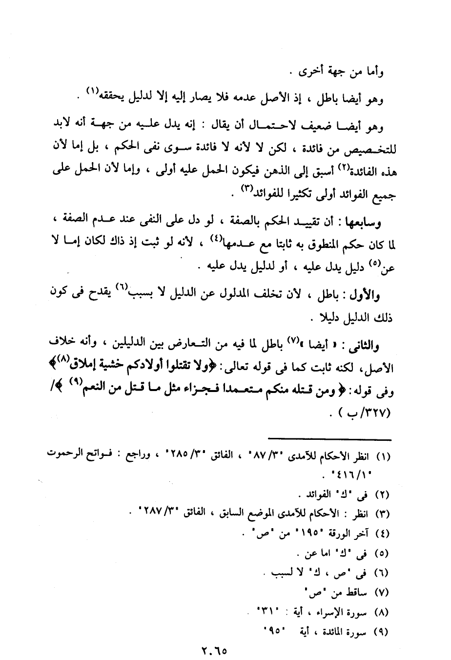 والثاني: "أيضًا" باطل لما فيه من التعارض بين الدليلين، وأنه خلاف الأصل، لكنه ثابت كما في قوله تعالى: {ولا تقتلوا أولادكم خشية إملاق} وفي قوله: {ومن قتله منكم متعمدًا فجزاء مثل ما قتل من النعم} / (327/ب).