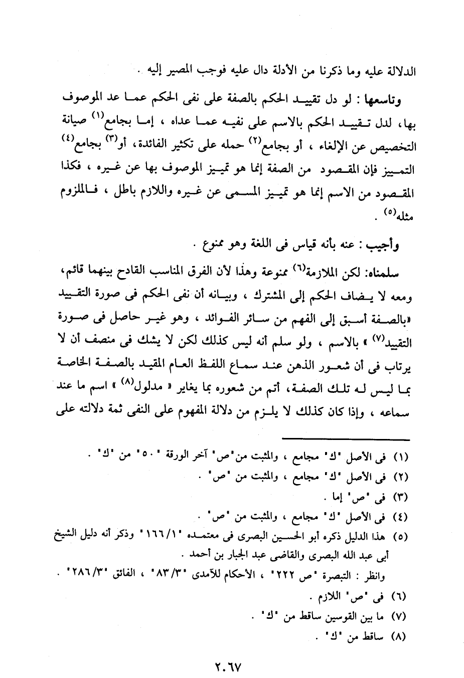وتاسعها: لو دل تقييد الحكم بالصفة على نفي الحكم عما عد الموصوف بها، لدل تقييد الحكم بالاسم على نفيه عما عداه، إما بجامع صيانة التخصيص عن الإلغاء، أو بجامع حمله على تكثير الفائدة، أو بجامع التمييز فإن المقصود من الصفة إنما هو تمييز الموصوف بها عن غيره، فكذا المقصود من الاسم إنما هو تمييز المسمى عن غيره واللازم باطل، فالملزوم مثله.