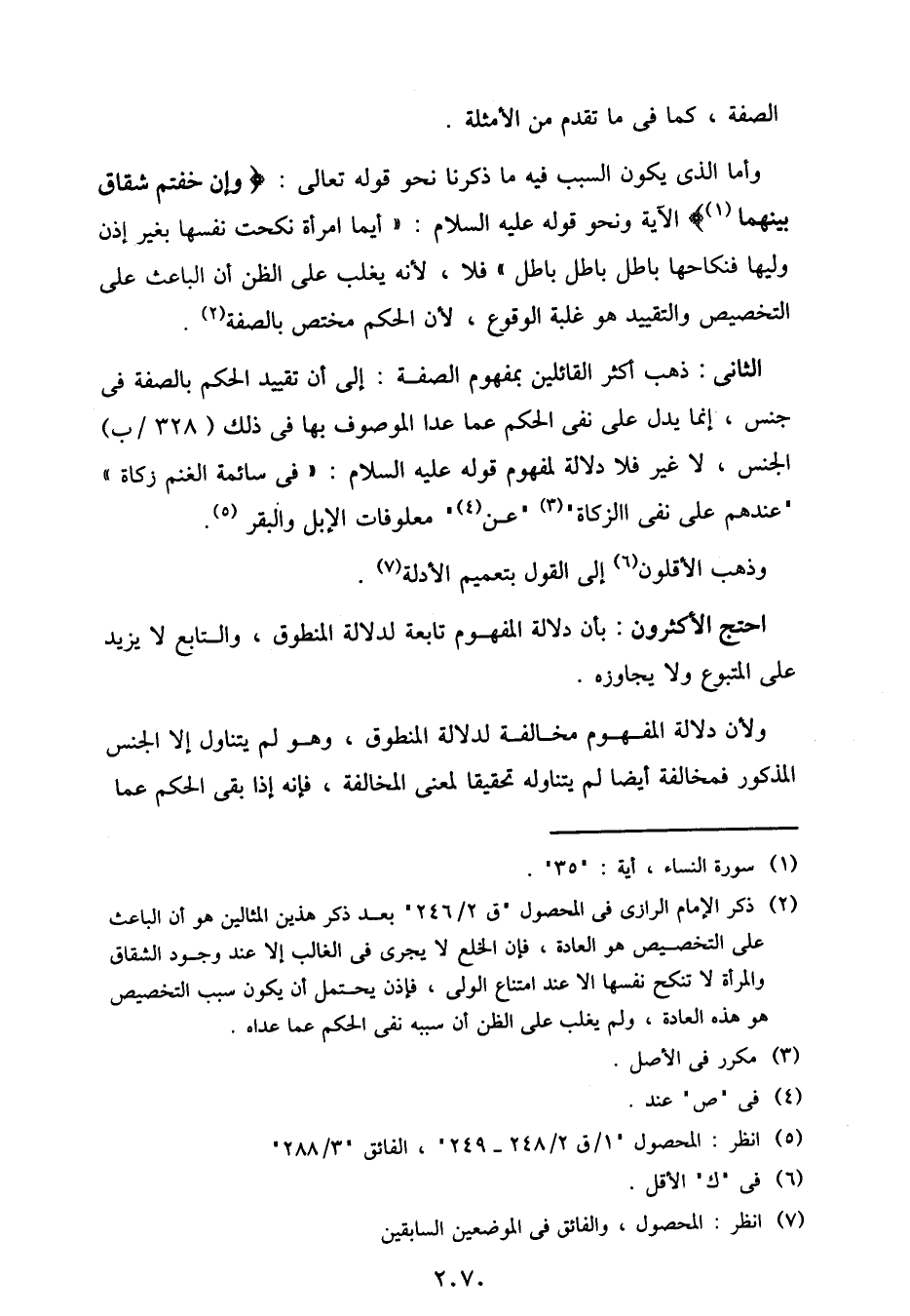 الثاني: ذهب أكثر القائلين بمفهوم الصفة: إلى أن تقييد الحكم بالصفة في جنس، إنما يدل على نفي الحكم عما عدا الموصوف بها في ذلك (328/ب) الجنس، لا غير فلا دلالة لمفهوم قوله عليه السلام: "في سائمة الغنم زكاة" "عندهم على نفي الزكاة" "عن" معلوفات الإبل والبقر.
