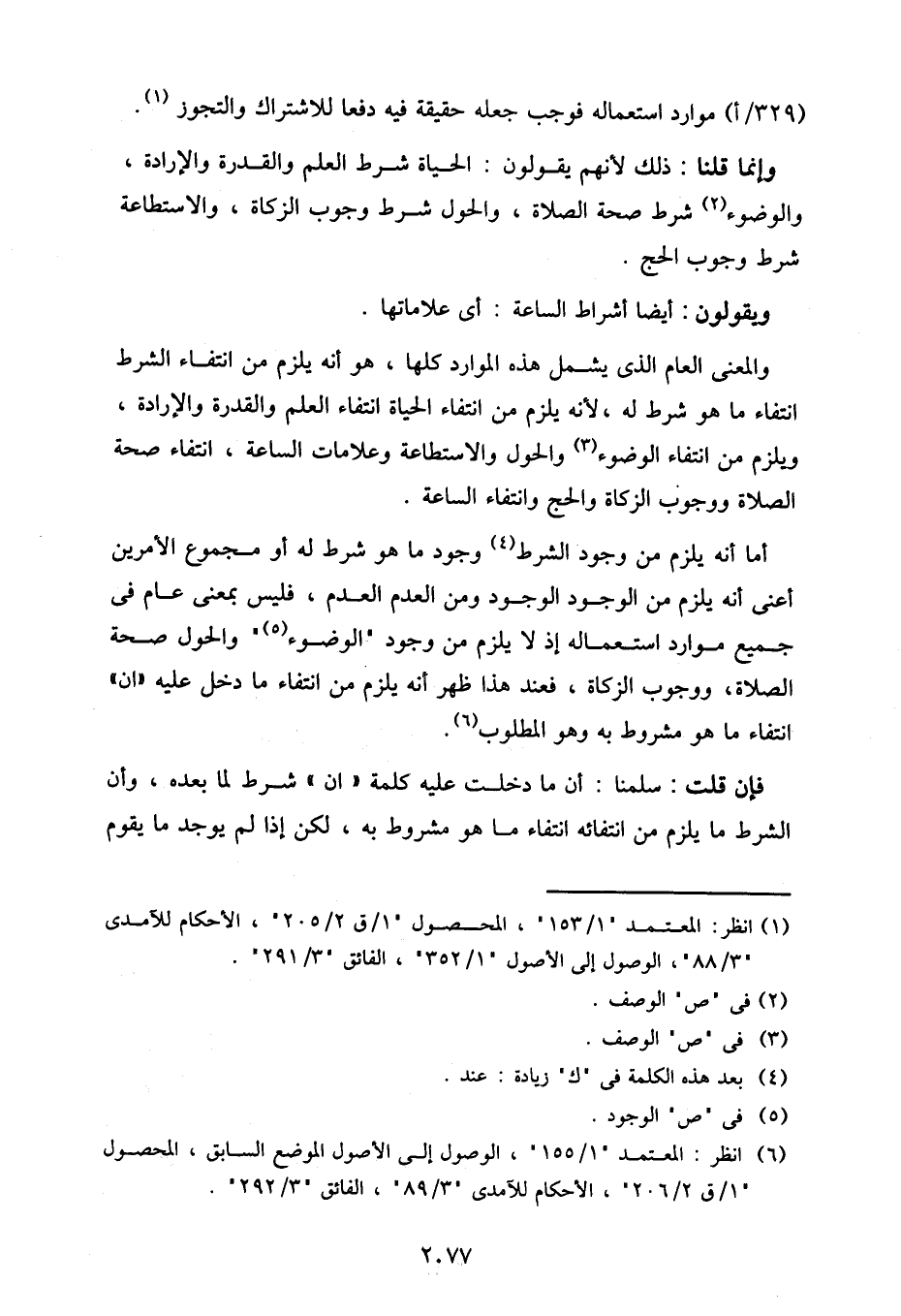 وإنما قلنا: ذلك لأنهم يقولون: الحياة شرط العلم والقدرة والإرادة، والوضوء شرط صحة الصلاة، والحول شرط وجوب الزكاة، والاستطاعة شرط وجوب الحج.