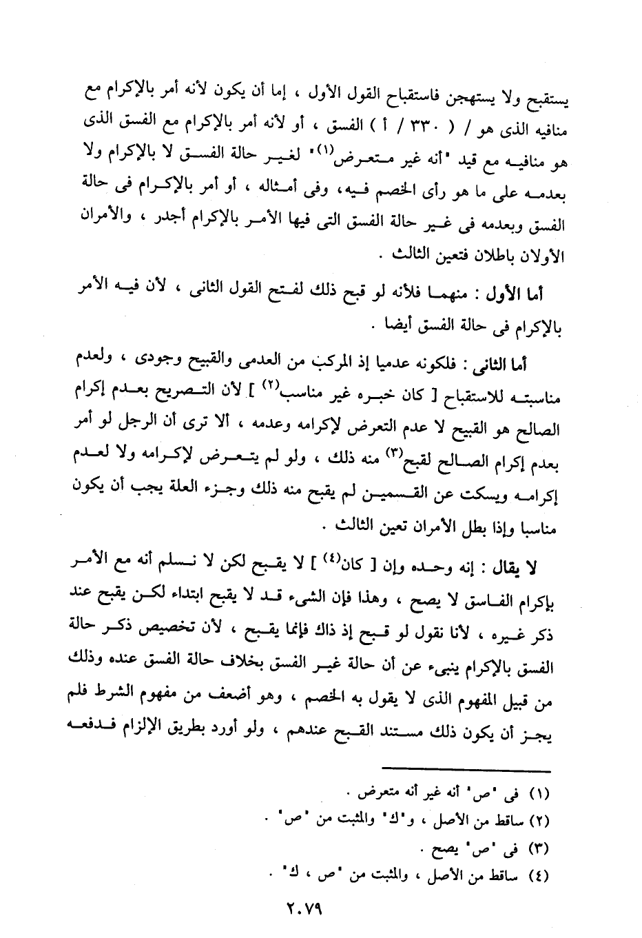 يستقبح ولا يستهجن فاستقباح القول الأول، إما أن يكون لأنه أمر بالإكرام مع منافيه الذي هو/ (330/أ) الفسق، أو لأنه أمر بالإكرام مع الفسق الذي هو منافيه مع قيد "أنه غير متعرض" لغير حالة الفسق لا بالإكرام ولا بعدمه على ما هو رأي الخصم فيه، وفي أمثاله، أو أمر بالإكرام في حالة الفسق وبعدمه في غير حالة الفسق التي فيها الأمر بالإكرام أجدر، والأمران الأولان باطلان فتعين الثالث.