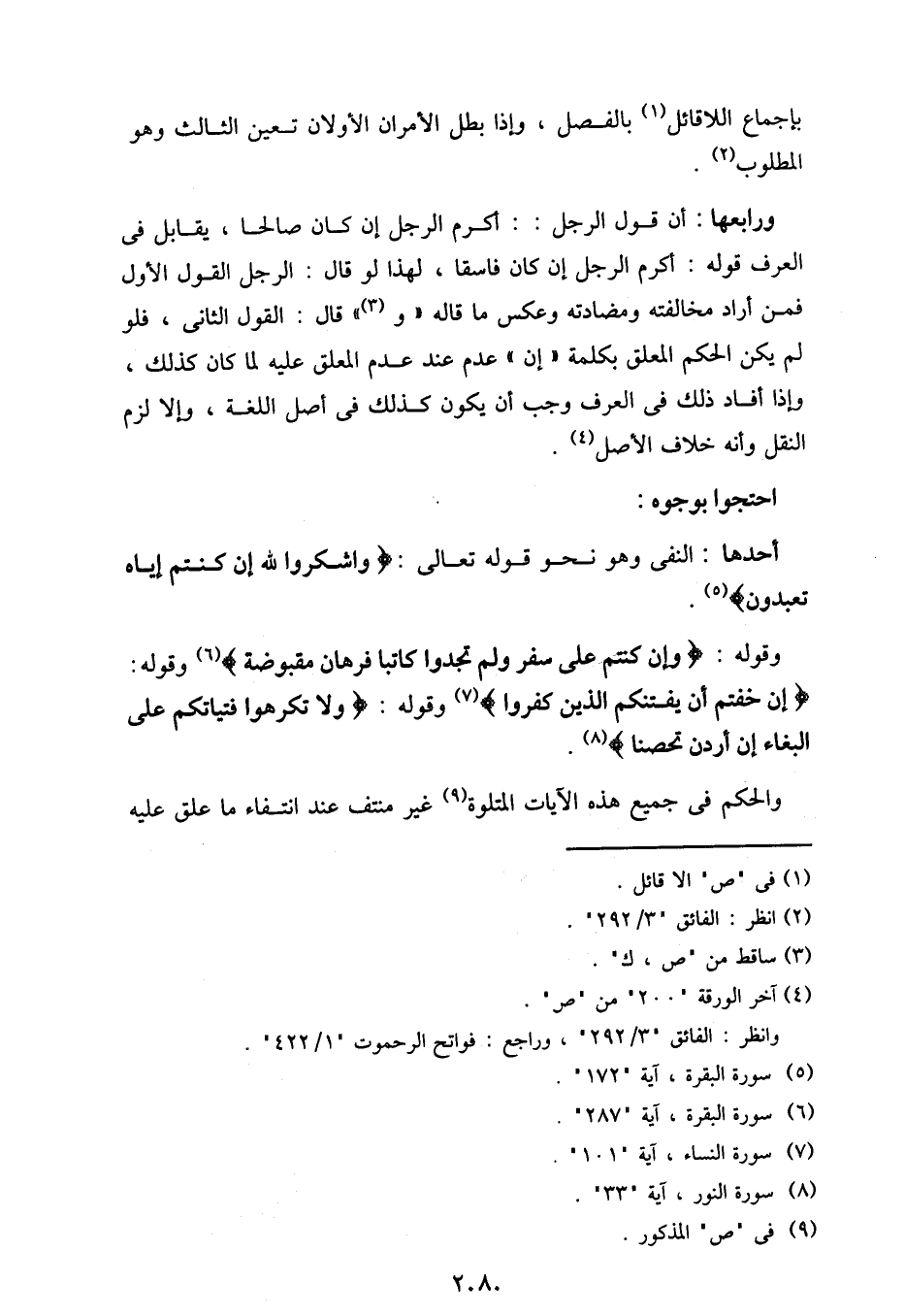 ورابعها: أن قول الرجل: أكرم الرجل إن كان صالحًا، يقابل في العرف قوله: أكرم الرجل إن كان فاسبقًا، لهذا لو قال: الرجل القول الأول فمن أراد مخالفته ومضادته وعكس ما قاله "و" قال: القول الثاني، فلو لم يكن الحكم المعلق بكلمة "إن" عدم عند عدم المعلق عليه لما كان كذلك، وإذا أفاد ذلك في العرف وجب أن يكون كذلك في أصل اللغة، وإلا لزم النقل وأنه خلاف الأصل.