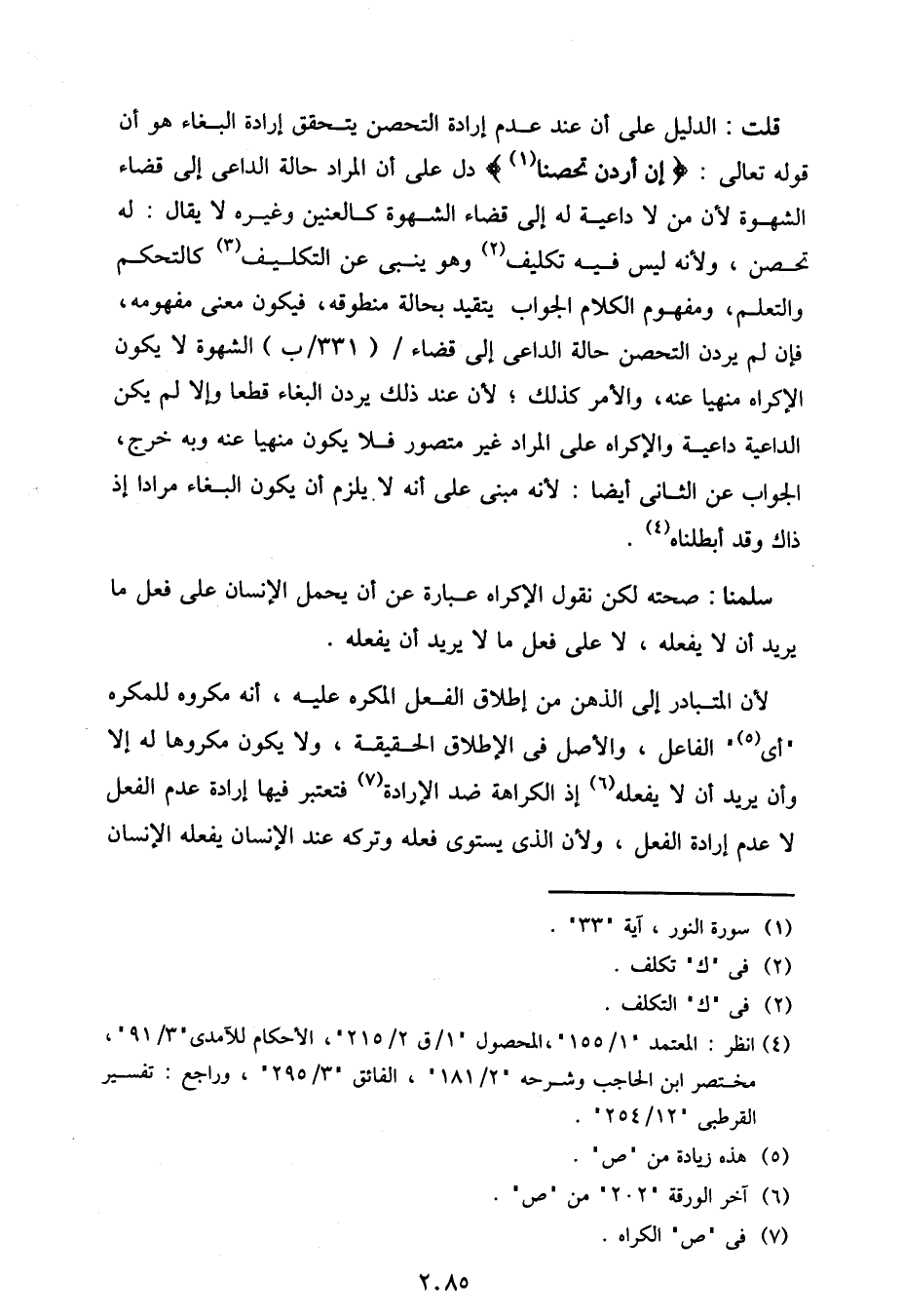 قلت: الدليل على أن عند عدم إرادة التحصن يتحقق إرادة البغاء هو أن قوله تعالى: {إن أردن تحصنا} دل على أن المراد حالة الداعي إلى قضاء الشهوة لأن من لا داعية له إلى قضاء الشهوة كالعنين وغيره لا يقال: له تحصن، ولأنه ليس فيه تكليف وهو ينبي عن التكليف كالتحكم والتعلم، ومفهوم الكلام الجواب يتقيد بحالة منطوقة، فيكون معنى مفهومه، فإن لم يردن التحصن حالة الداعي إلى قضاء/ (331/ب) الشهوة لا يكون الإكراه منهيًا عنه، والأمر كذلك؛ لأن عند ذلك يردن البغاء قطعًا وإلا لم يكن الداعية داعية والإكراه على المراد غير تصور فلا يكون منهيًا عنه وبه خرج، الجواب عن الثاني أيضًا: لأنه مبني على أنه لا يلزم أن يكون البغاء مرادًا إذ ذاك وقد أبطلناه.