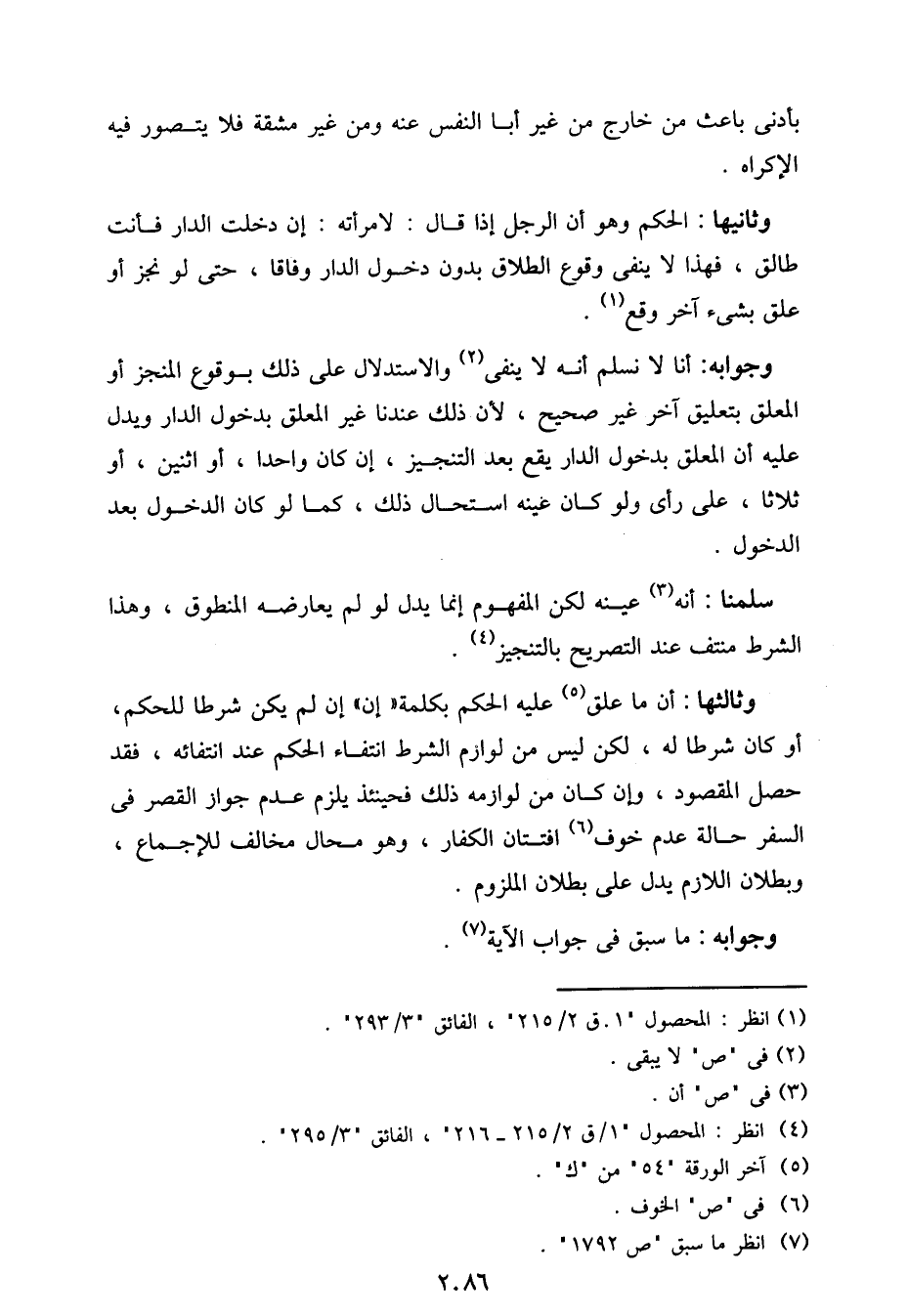 وثالثها: أن ما علق عليه الحكم بكلمة "إن" إن لم يكن شرطًا للحكم، أو كان شرطًا له، لكن ليس من لوازم الشرط انتفاء الحكم عند انتفائه، فقد حصل المقصود، وإن كان من لوازمه ذلك فحينئذ يلزم عدم جواز القصر في السفر حالة عدم خوف افتتان الكفار، وهو محال مخالف للإجماع، وبطلان اللازم يدل على بطلان الملزوم.