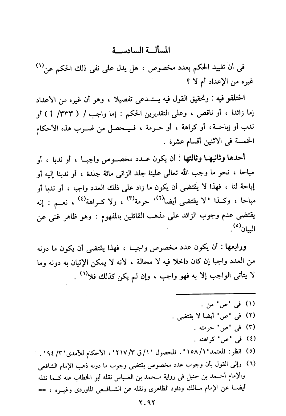 أحدها وثانيها وثالثها: أن يكون عدد مخصوص واجبًا، أو ندبًا، أو مباحًا، نحو ما وجب الله تعالى علينا جلد الزاني مائة جلدة، أو ندبنا إليه أو إباحة لنا، فهذا يقتضي أن يكون ما زاد على ذلك العدد واجبًا، أو ندبًا أو مباحًا، وكذا "لا يقتضي أيضًا" حرمة، ولا كراهة، نعم: إنه يقتضي عدم وجوب الزائد على مذهب القائلين بالمفهوم: وهو ظاهر غني عن البيان.