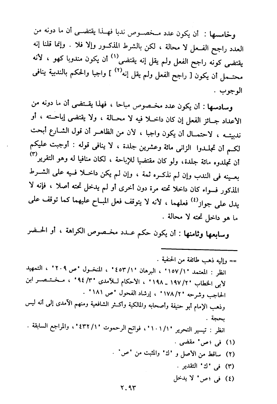 وخامسها: أن يكون عدد مخصوص ندبًا فهذا يقتضي أن ما دونه من العدد راجح الفعل لا محالة، لكن بالشرط المذكور وإلا فلا. وإنما قلنا إنه يقتضي كونه راجح الفعل ولم يقل إنه يقتضي أن يكون مندوبًا كهو، لأنه محتمل أن يكون [راجح الفعل ولم يقل إنه] واجبًا والحكم بالندبية ينافي الوجوب.