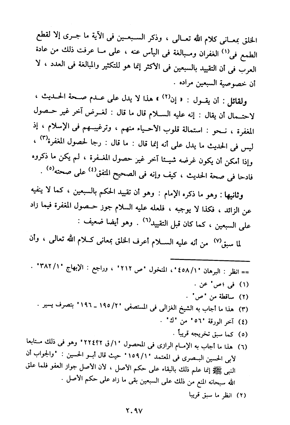 الخلق بمعاني كلام الله تعالى، وذكر السبعين في الآية ما جرى إلا لقطع الطمع في الغفران ومبالغة في اليأس عنه، على ما عرفت ذلك من عادة العرب في أن التقييد بالسبعين في الأكثر إنما هو للتكثير والمبالغة في العدد، لا أن خصوصية السبعين مراده.