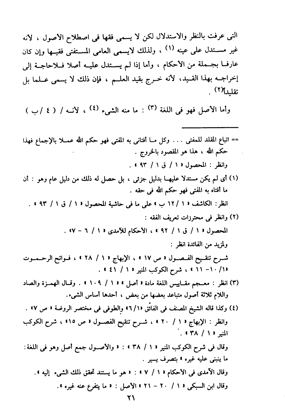 التي عرفت بالنظر والاستدلال لكن لا يسمى فقها في اصطلاح الأصول، لأنه غير مستدل على عينه، ولذلك لا يسمى العامي المستفتى فقيها وإن كان عارفا بجملة من الأحكام، وأما إذا لم يستدل عليه أصلا فلا حاجة إلى إخراجه بهذا القيد، لأنه خرج بقيد العلم، فإن ذلك لا يسمى علما بل تقليدا.