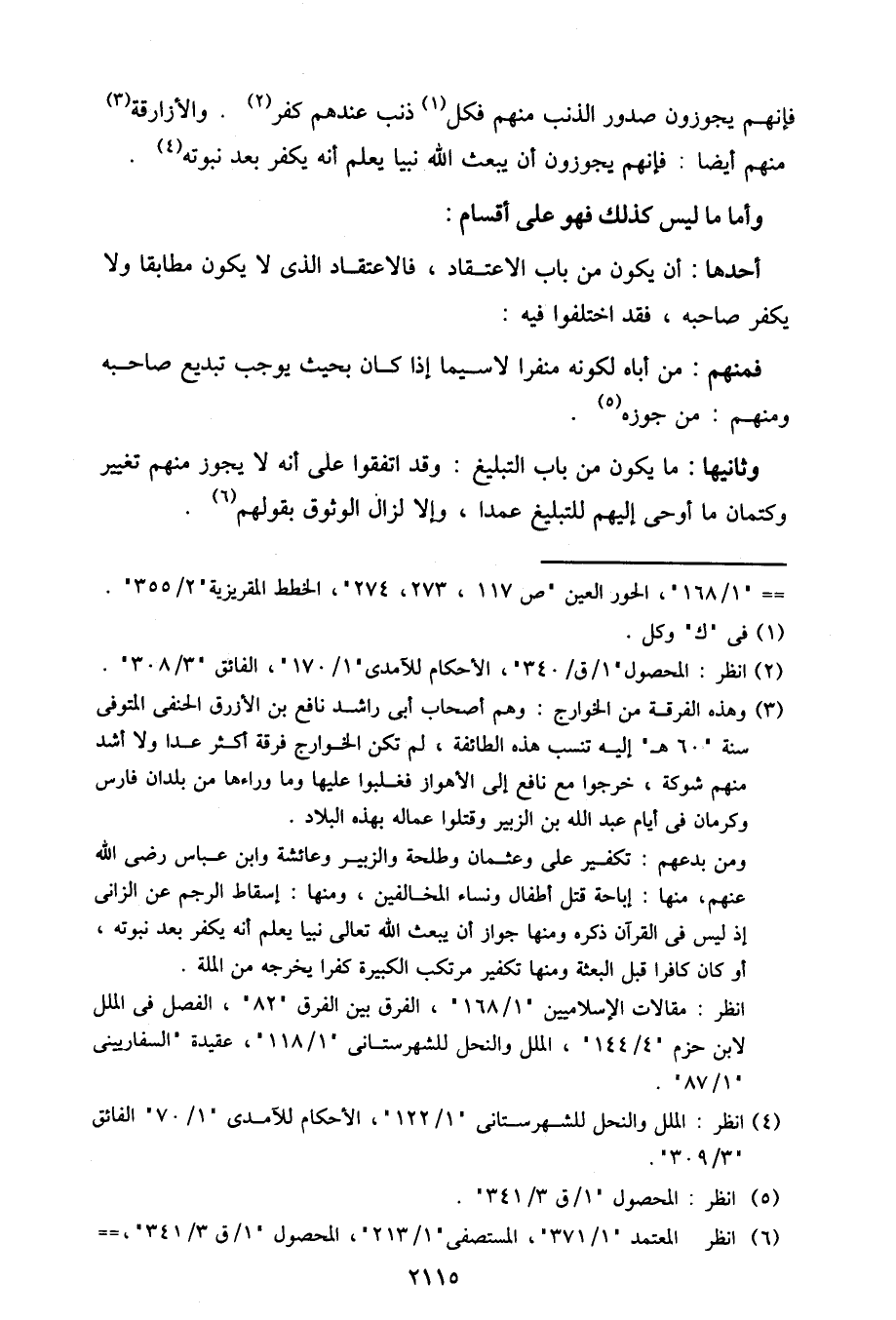 فإنهم يجوزون صدور الذنب منهم فكل ذنب عندهم كفر. والأزارقة منهم أيضًا: فإنهم يجوزون أن يبعث الله نبيًا يعلم أنه يكفر بعد نبوته.